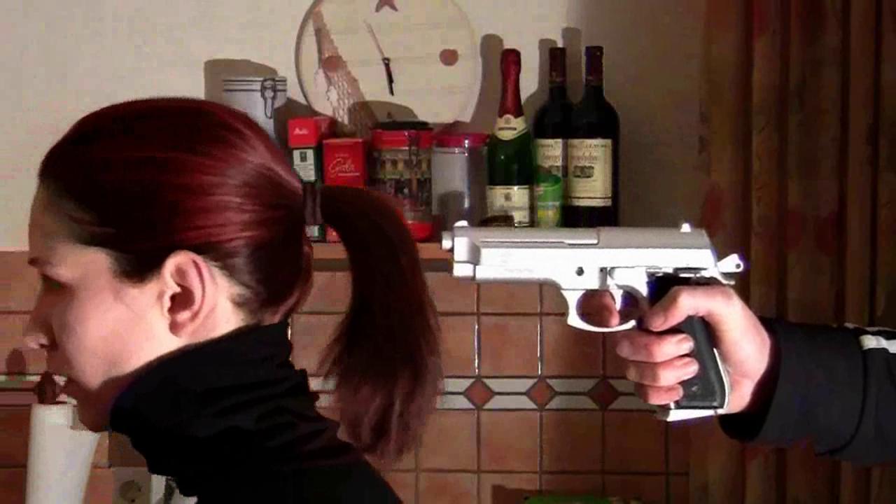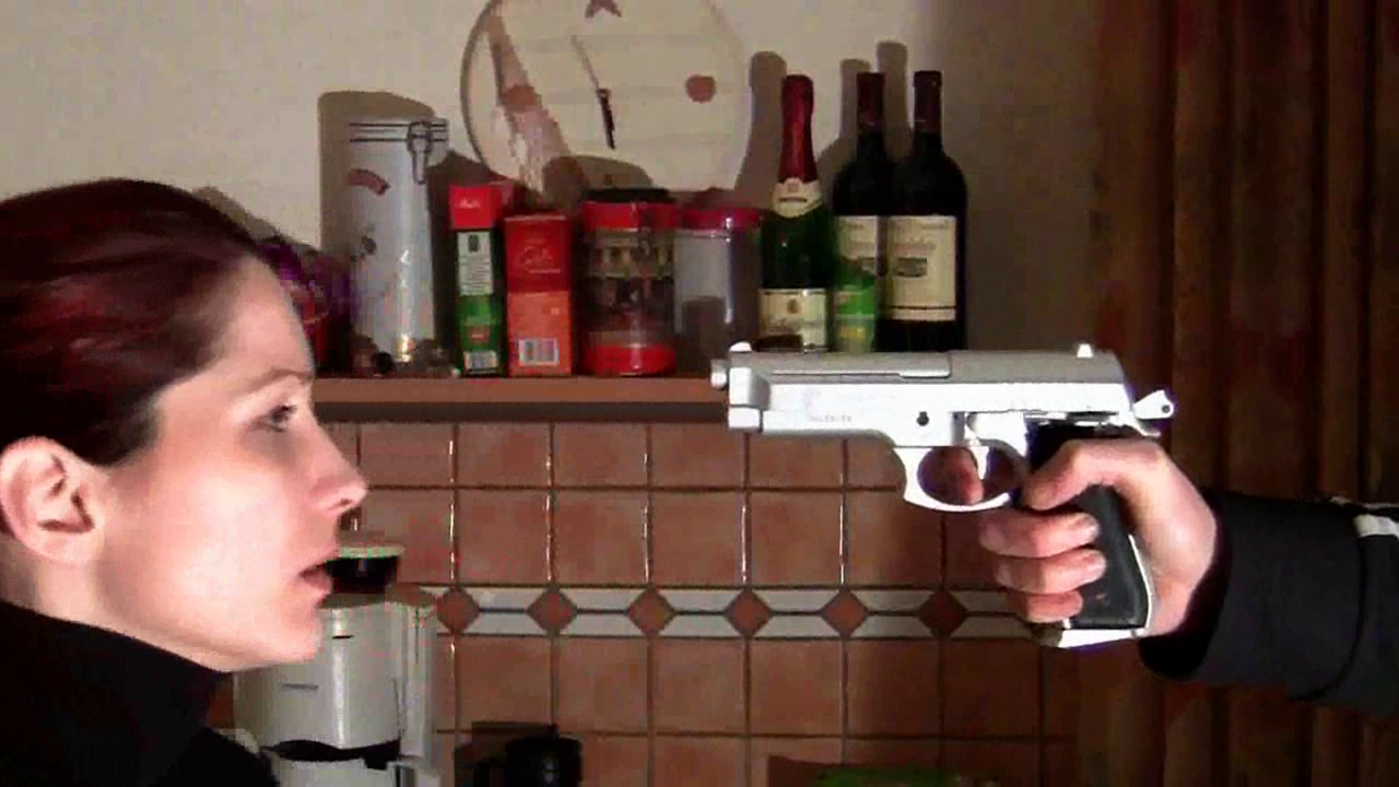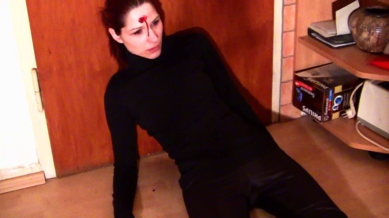 A zako tried to shoot the spy, but he was too quick, and she gets shot and falls on top of a table.