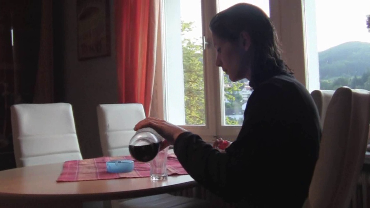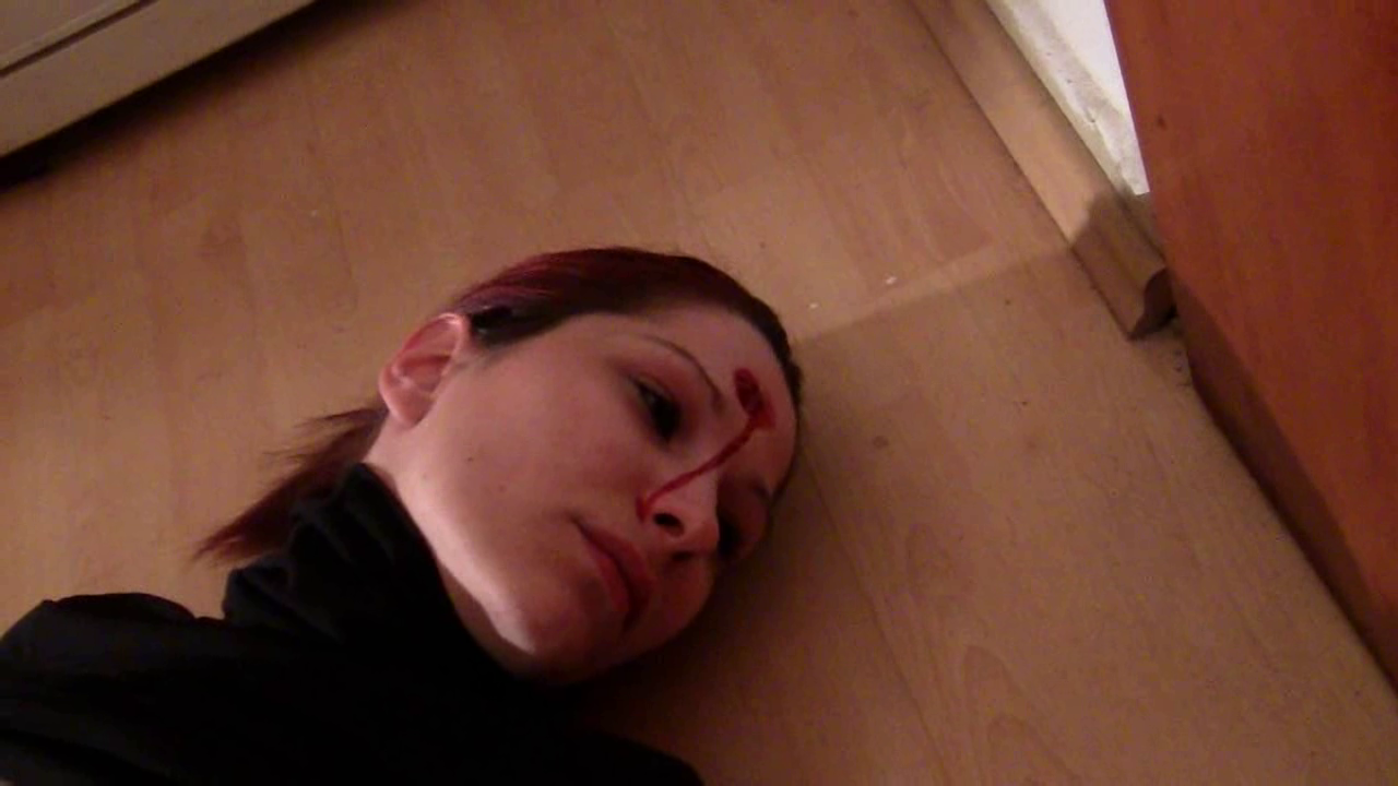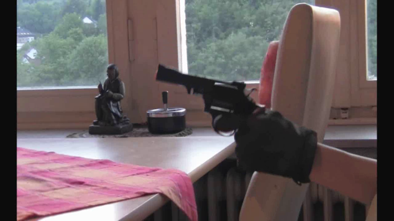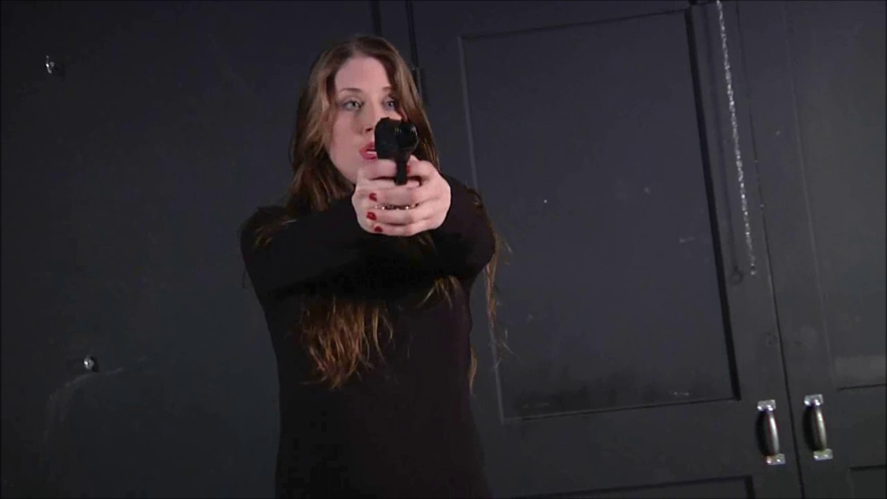 A zako tried to shoot the spy, but he was too quick, and she gets shot and falls on top of a table.