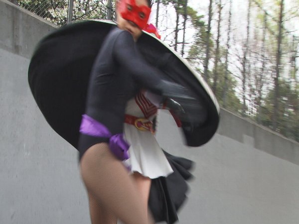 A zako spots the hero spy who is trying to infiltrate the enemy compound. She tries to shoot him.