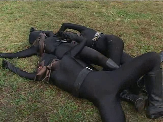 A group of Zako attack the female heroine, but she is able to fight them off, knocking a few out as they fall in a body pile. She then knocks out the rest by hitting their heads against one another.
