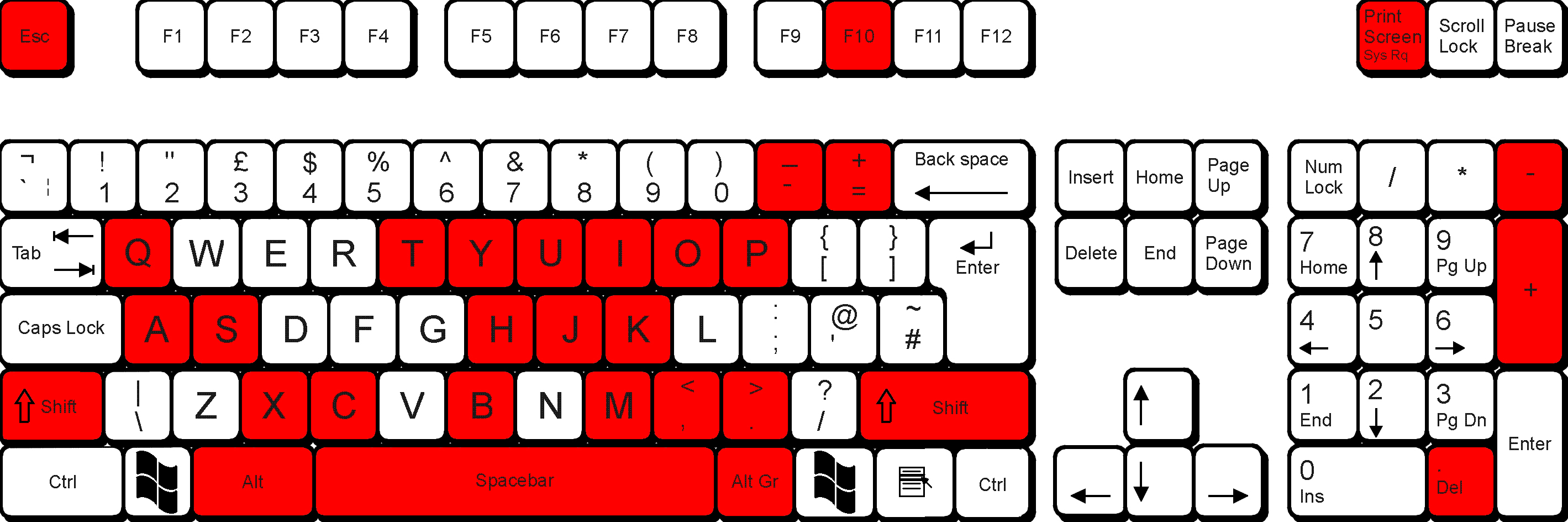 Before you open the Keys.swf file to set up your keys, you'll want to know what keys you can and can't use. The red keys cannot be used for the mod loader's shortcuts. All other keys may be used. This may change if Konashion adds any new keyboard shortcuts.