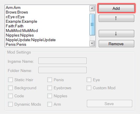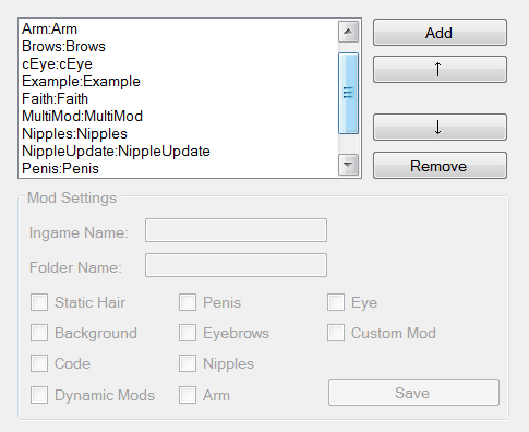 Arm: When you check this box, the mod manager will ask you to locate a .png or a .swf file for the arm. This png/swf file will modify the girl's arm (i.e. tattoo, armbands, robotics, etc.) This file will be copied to your character's directory.