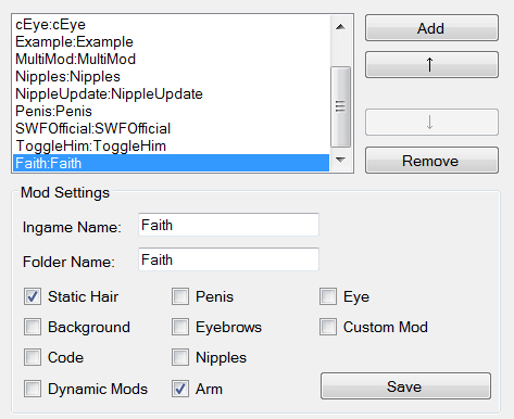 Custom Mods: When you check this box, the mod manager will ask you to locate a .swf file. This swf file is for custom swf mods made for the mod loader, this would be any swf mods for the mod loader that do not have their own category (i.e. wings, tails, futa, etc.) This file will be copied to your character's directory. In order to select multiple mods, you just select multiple files.