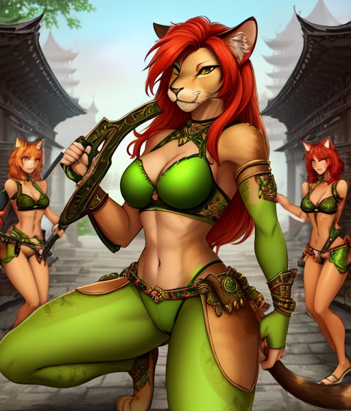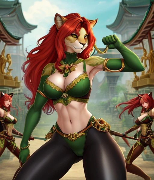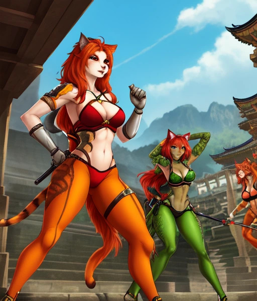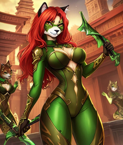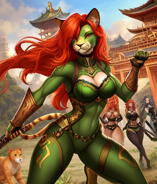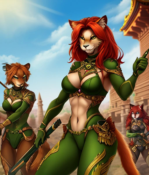 Hi everyone, I upload another portion of informations about my zako world. This time I give you some news about Kornelia and her Empire of the Fang :wink: She is a very beautiful redhead leopard with long curled hair. Similiar to Shania she is a Queen but opposite to Shania who want to protect Jega in a peaceful way, her goal is to conquer Jega and all of its inhabitants at all costs. Her hidden agenda is to make slaves from every male and wipe out all members of the Brotherhood as well as every female from Shania's Empire and common female Jegans. She wants to spread her and her warriors genes on the Jega. She has 75 millions of warriors and almost 1300 bases. To rule without any problems Kornelia has some advisors known as the Triumvirate. It consists of three High Generals. - Sabina (blonde leopard) Grintia (brown haired black panther) and Ayane (redhead tigress)