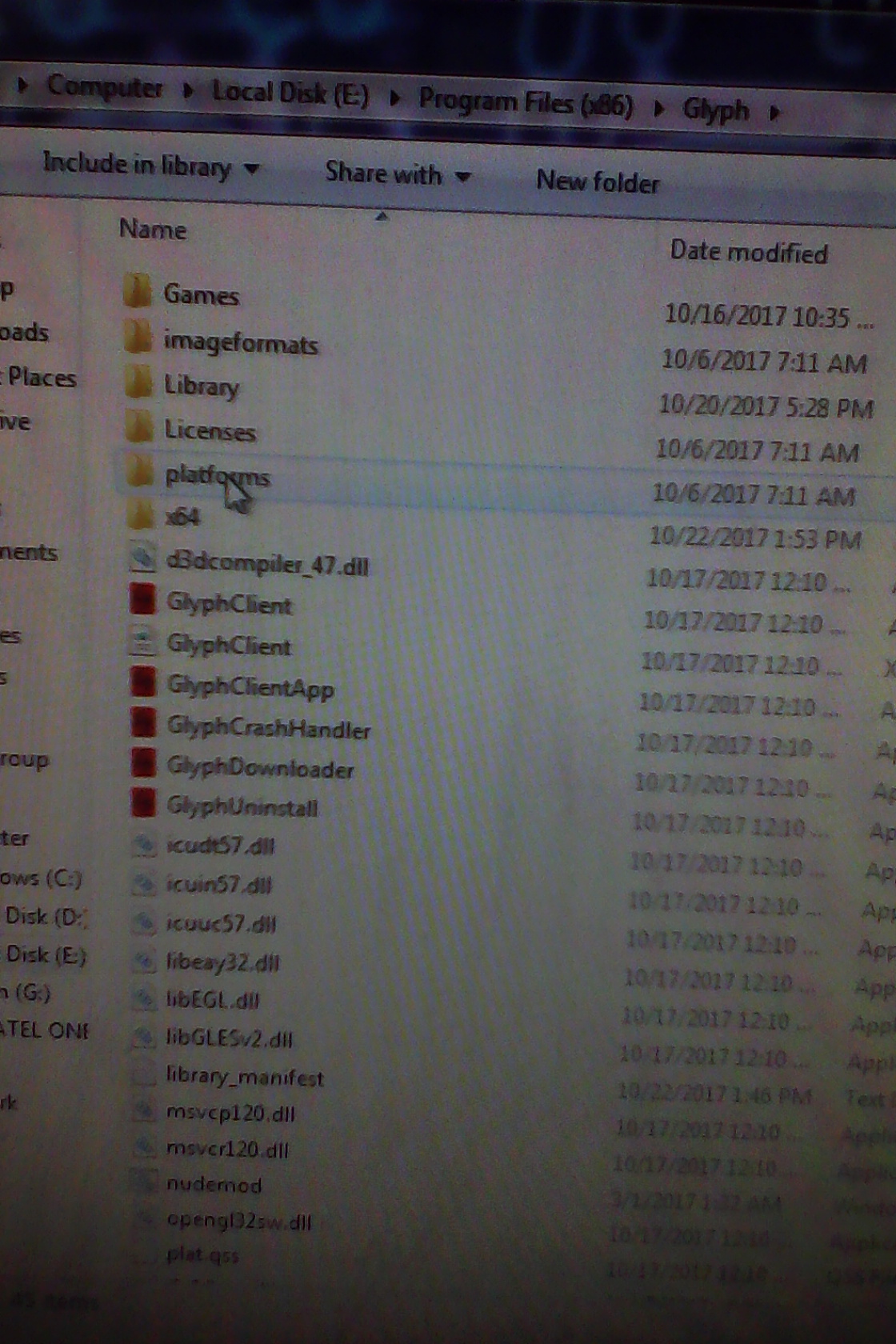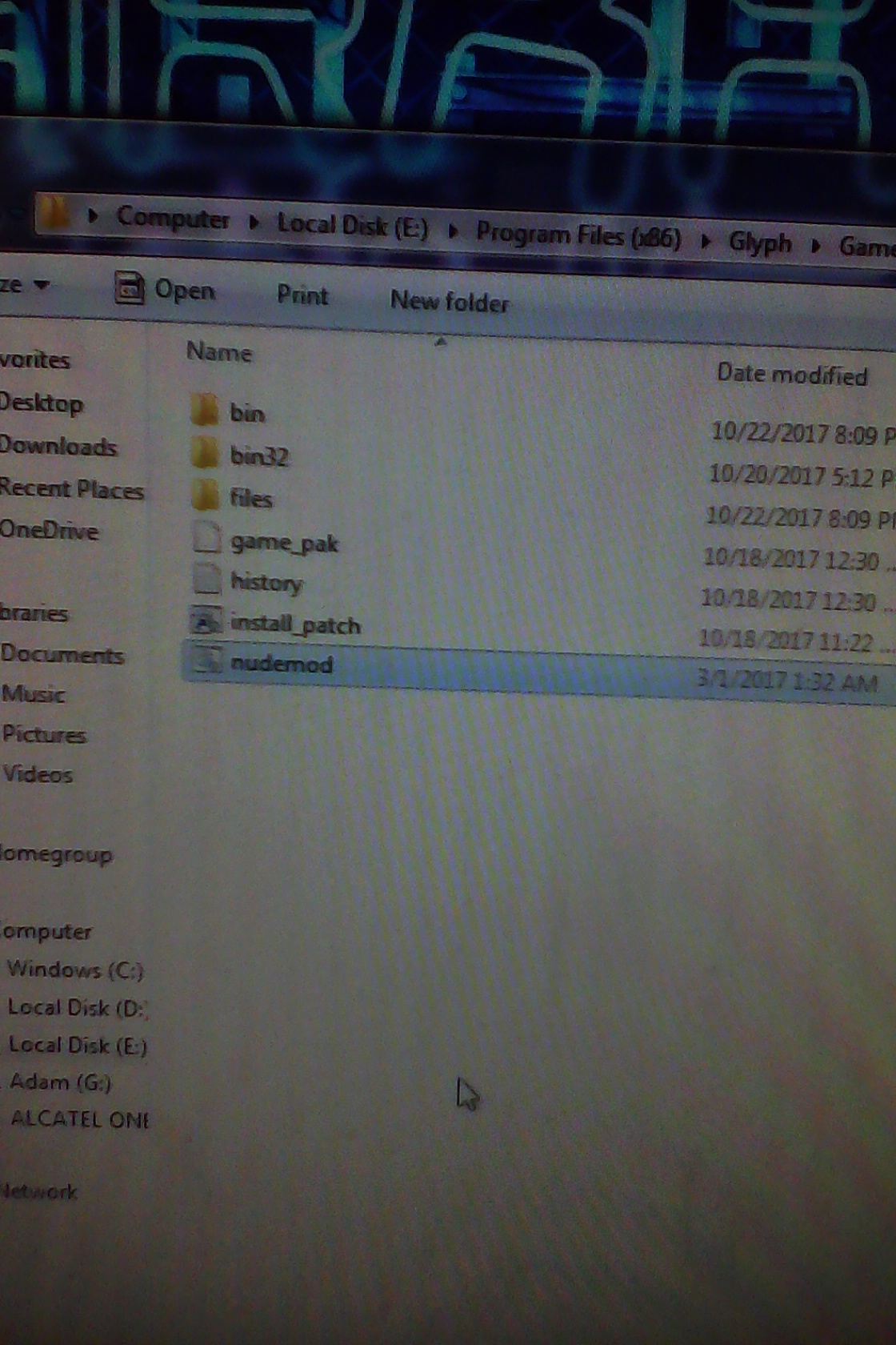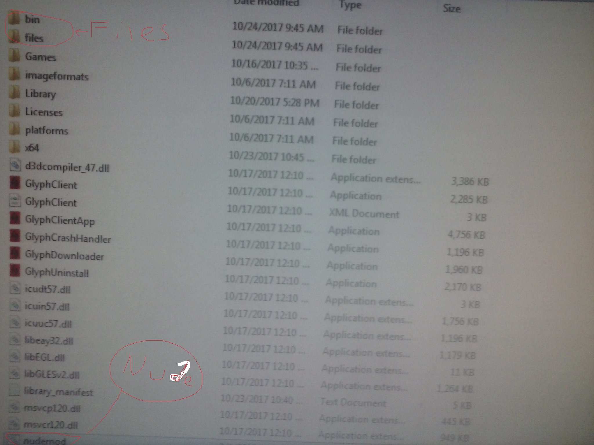 I put the files [file], bin [file] & nudemod [bat] in My Glyph Folder [ This PC > Local Disc (C:) > Program Files (x86) > Glyph ]