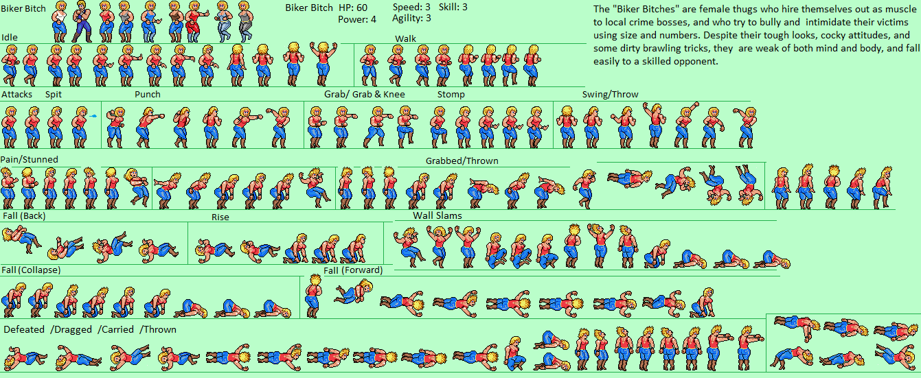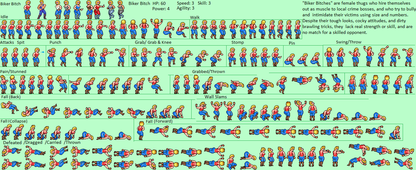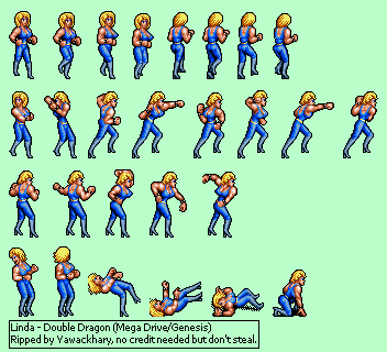 I know at least a couple posters on this forum have done custom sprite edits, or other artwork, of some female zako. Some have even had artwork commissioned. So show your original, unofficial, and/or edited zako here. As an example, for a beat-em-up / adventure game I've had in mind for a while, I wanted one of the basic enemy mooks to be a female zako, and while looking for inspiration, I found a sprite sheet of Linda from Double Dragon for Sega Genesis: