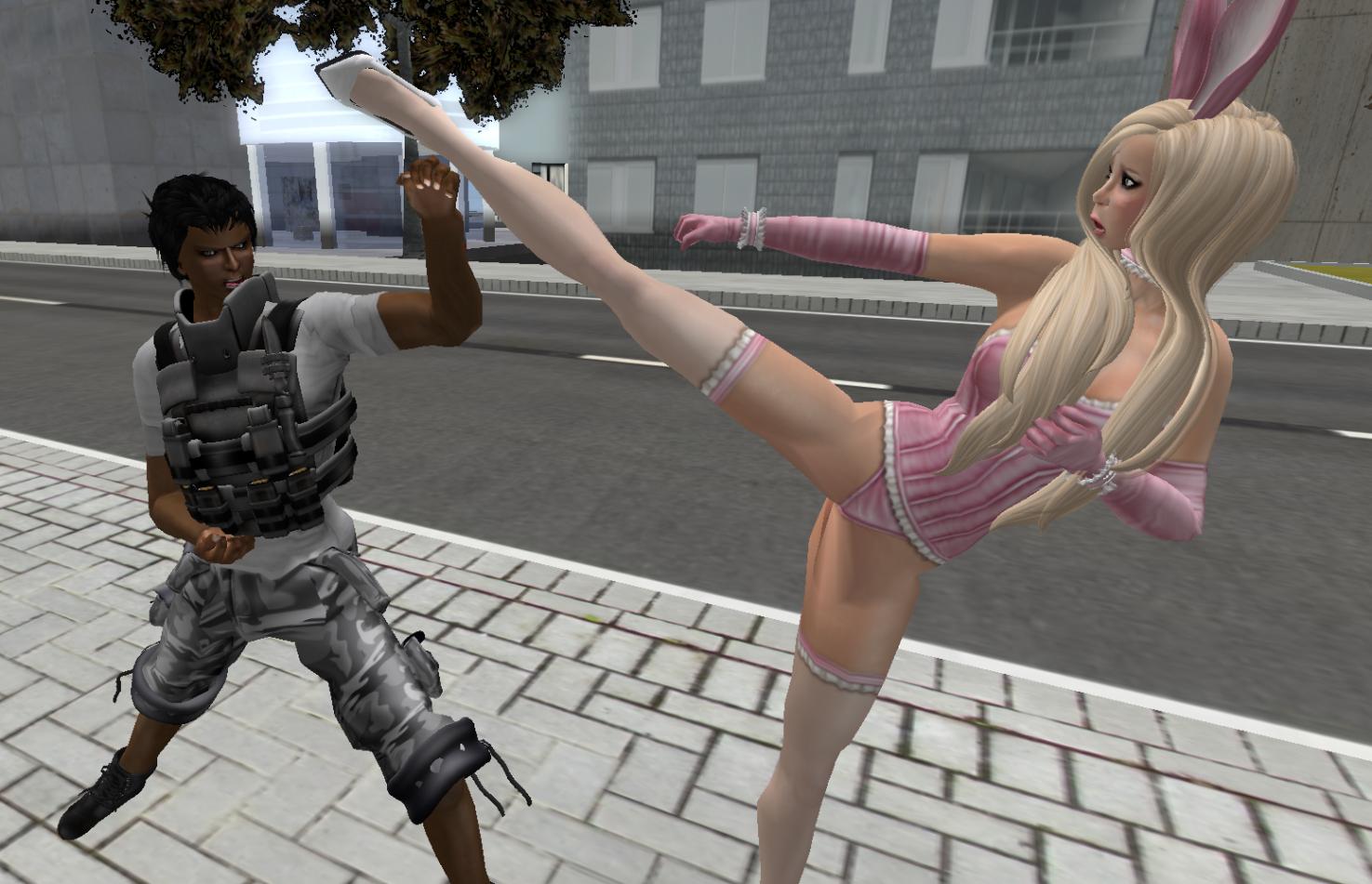 The Bunny goes for a quick kick... but is easily blocked, leaving her open...