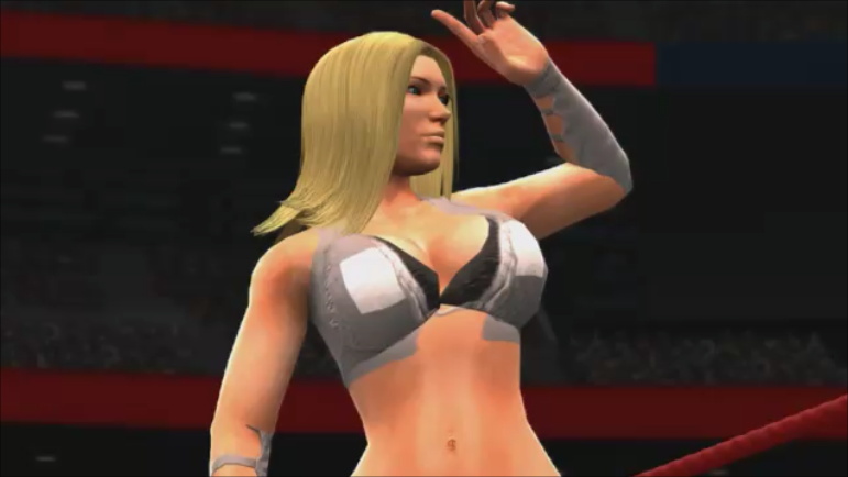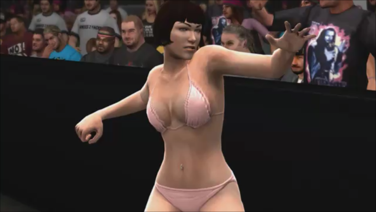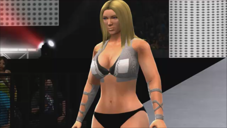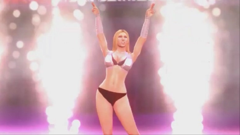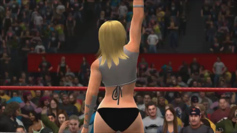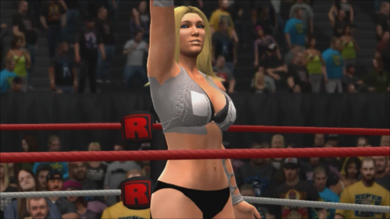 After the introduction, the teenage idol rose a fist up toward the sky. Bursts of white fireworks blasted on the stage, giving the crowd some excitement. The light radiated from the sparks of the fireworks radiated her perfect bust and slender body. Once the pyro show was over, the teenage idol sprinted down the ramp and towards the ring, giving the audience members high-fives as she passes them by.