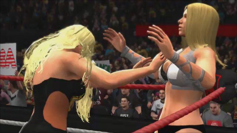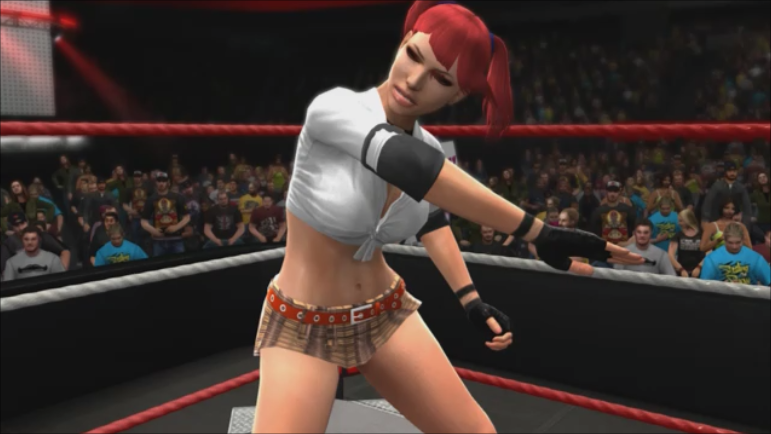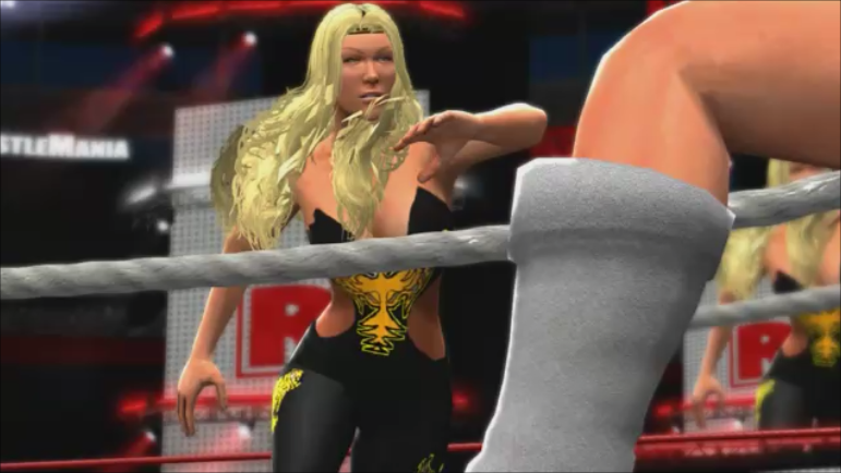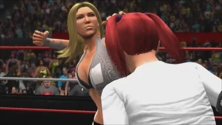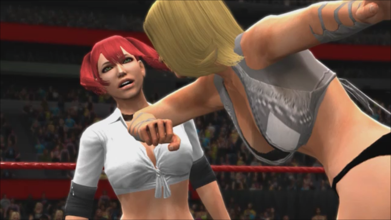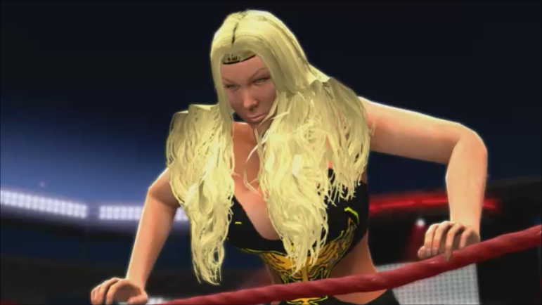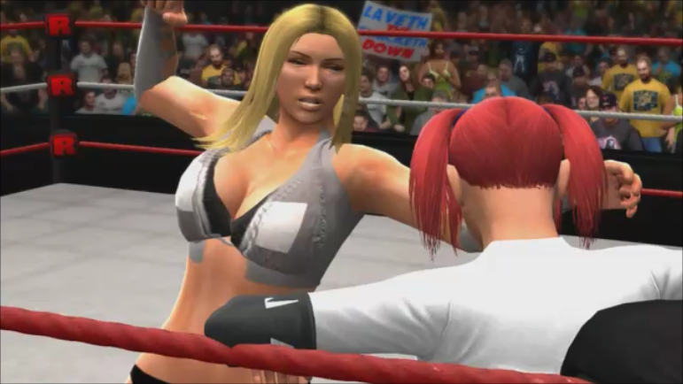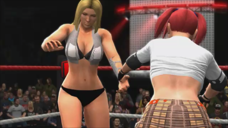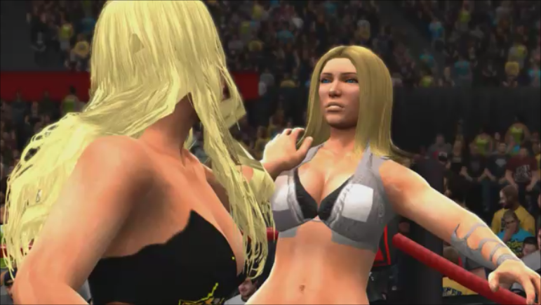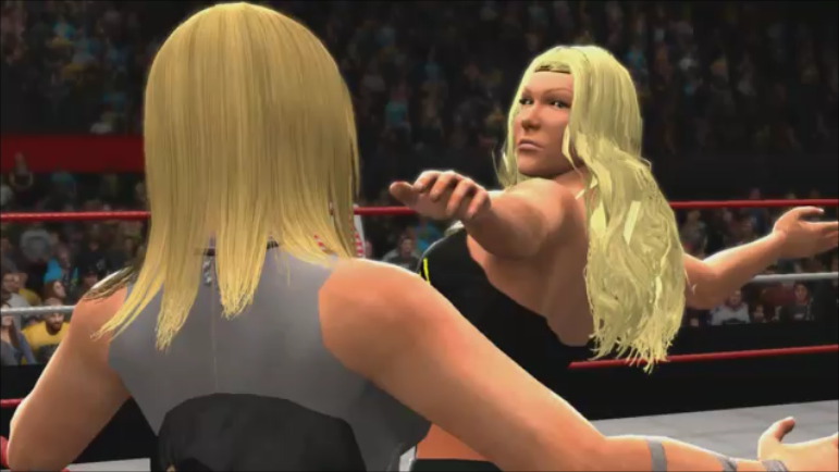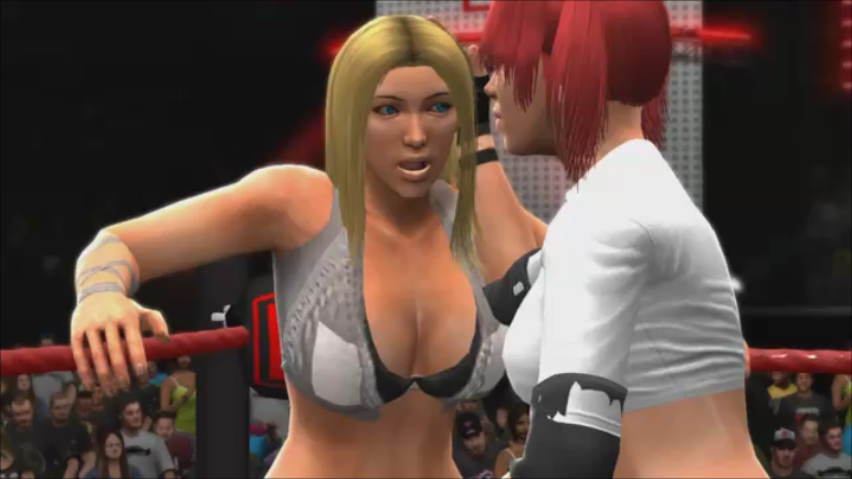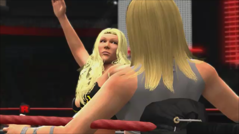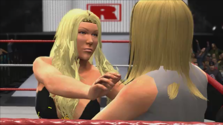 The Canadian skipped down the ramp and rolled into the ring. The first woman to greet her was Tina Armstrong. The blonde gave the crimson haired teenager a toe kick to the ribs.