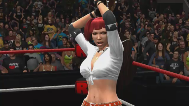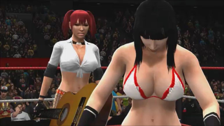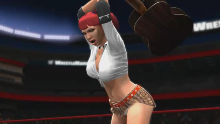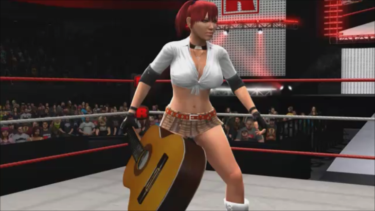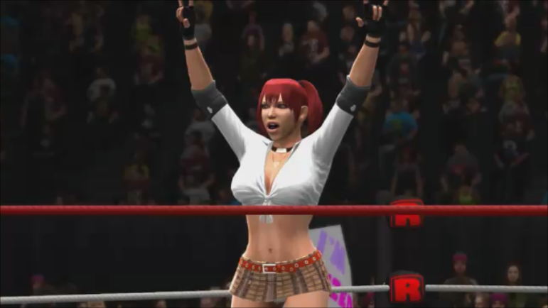 Candy Cane rose her guitar toward the roof and unleashed a vicious battle cry, showing her dominance and ruthless aggression to the crowd. While about a quarter of the crowd cheered for their favorite wrestler from Rumble Roses, everyone else jeered and booed the crimson haired woman. Apparently, not everyone was pleased with the guitar shots Sakura took, courtesy of Candy Cane's weapon.