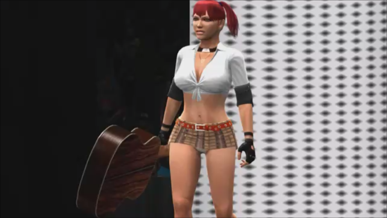 This eighteen year old girl looked like she was a trouble maker in school. Her bright crimson red hair was pulled up into twin ponytails. Her long red bangs came down in the front, partly obscuring her dark eyebrows. She had a black choker around her neck, with a heart-shaped locket hanging from it. The hem of her dress shirt was rolled up and the front is tied into a knot, exposing her cleavage. Her sleeves were also rolled up past her elbows, with black elbow pads fingerless gloves for emphasis of her tough, brawling style. She wore a pleated light brown and orange tartan skirt, with intersecting grids of white, black and red lines running along it. A large red leather belt with metal studs and grommets wrapped around her slender waist. Finally, she wore a pair of white, high-heeled boots that she uses to kick the asses of other bitches.