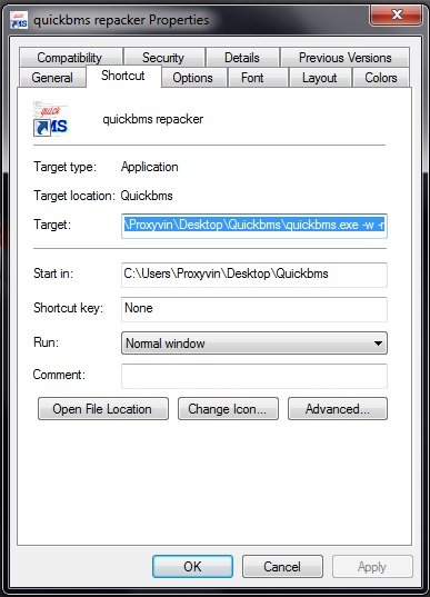 and for changing it to "C:\Users\username\Desktop\Quickbms\quickbms.exe -w -r" after exe make sure -w have space or you never gonna apply it and no quotes .