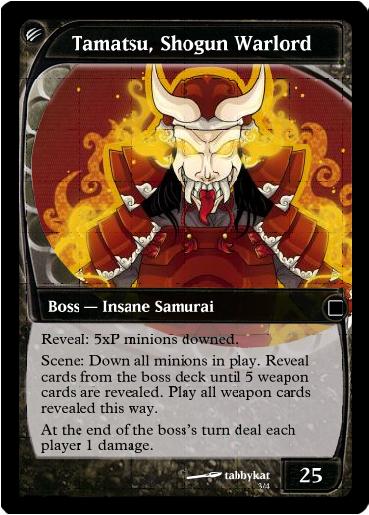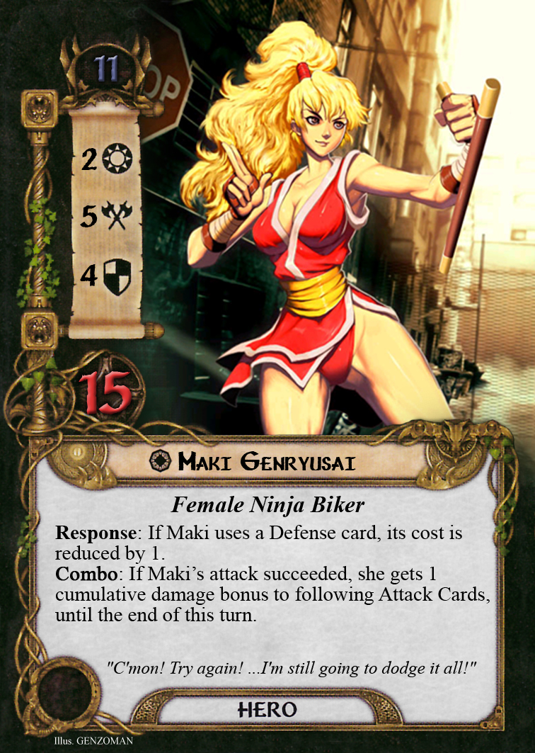 -Boss Card the ultimate goal of the game to eliminate this enemy, some will be as strong as the player(s) themselves, others may rely mostly on their underlings to win, giving zakos support and bonuses. (ex. Crime Lord, Super Villain, Giant Mecha)