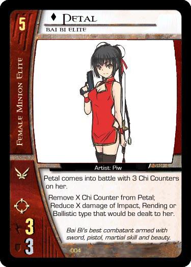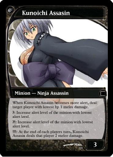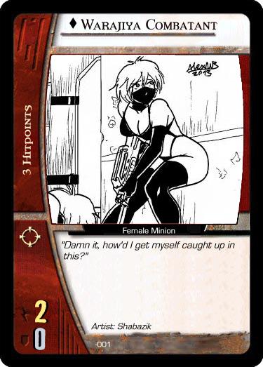 -Minion Cards enemies that player(s) will face over the course of the game. Most will be easily defeated zakos, but may include tougher, more elite zakos, to add a little variety and challenge for the players. (ex. Henchwomen, Security, Mercenaries)