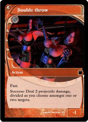 Double Hit (A): Discard to use. Use with an attack that would usually deal damage to one target, and apply it to two instead.