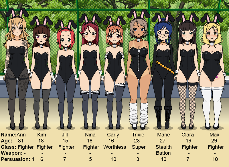 The setting is a world where superheroes exist, similar to the Marvel or DC universes. But, you're not those heroes of course. You are one of the many "Black Rabbits" of the all-female criminal "Usagi Black" organization, which in and of itself is an offshoot of Shader. It is a small part of an evil empire. Usagi Black's uniform consists of a black leotard and a bunny ear headband, but the dress code isn't strict. As long as a black leotard is present, any accessory is allowed. Some add a skirt, a jacket, unique shoes or gloves, or other things. The bunny headband can even be neglected or replaced with other headgear as long their allegiance to Usagi Black is still visually clear enough.