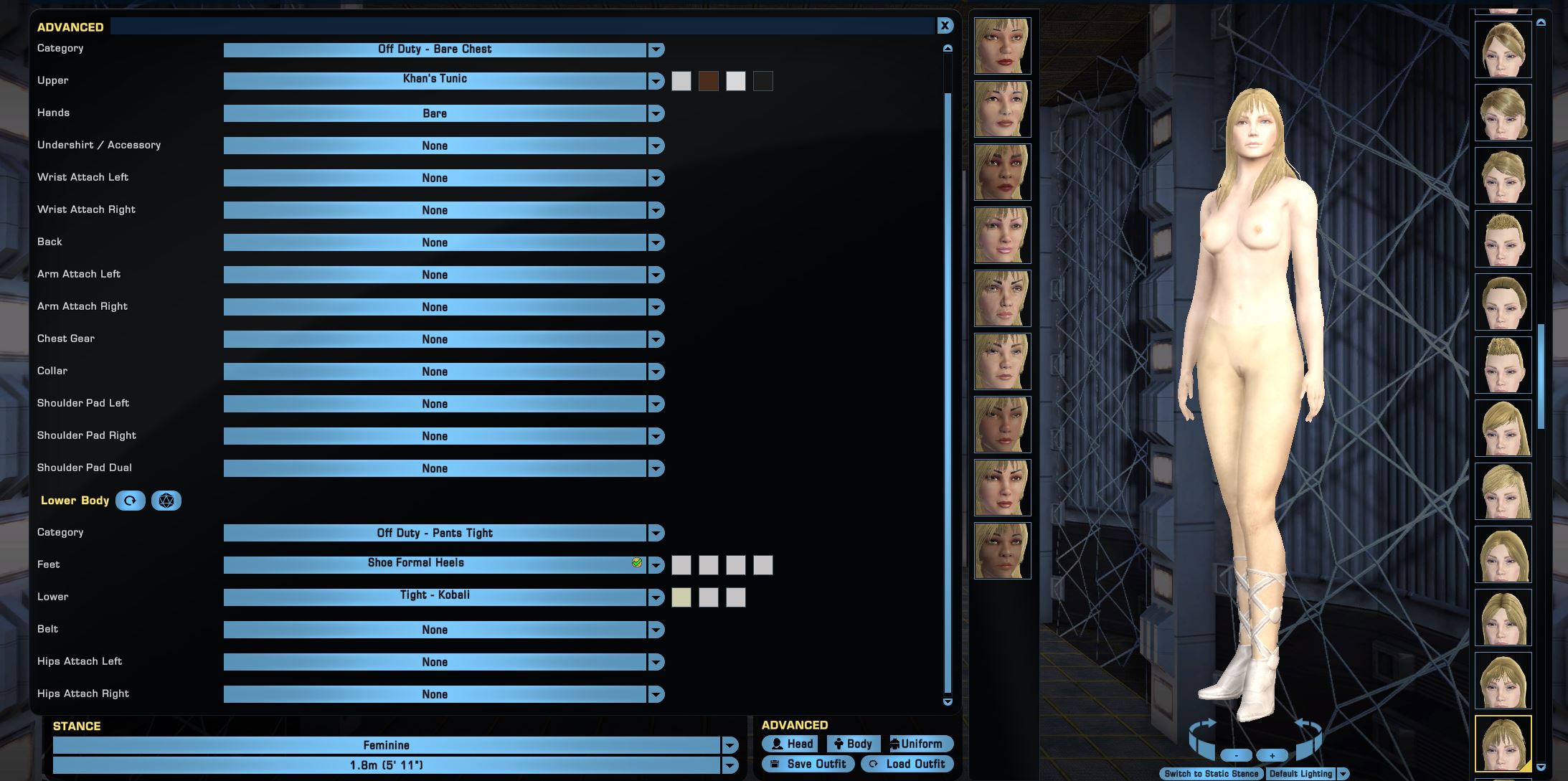 I don't know if that is a bug or duo to limitation issues, but since it seem possible with the TOS ripped uniform, would it also work for anything in the off duty tab? Cause with the uniform category it will always force me to wear shoes. Yet with off duty or beachwear my breasts are mysteriously shrinking.