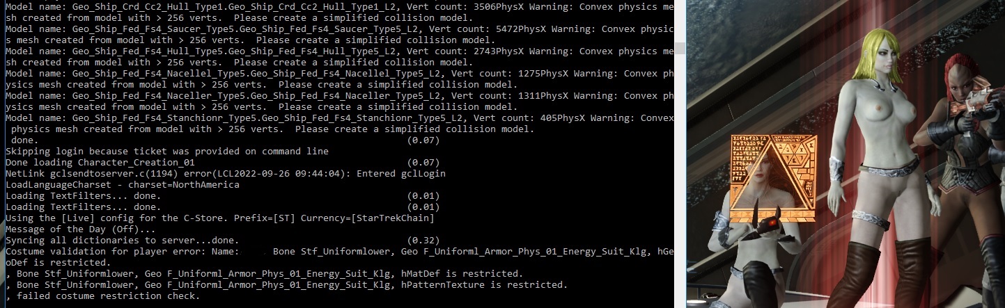 Interesting or concerning... when using the -console command on startup my character fails a costume check. Using the tattered top and colorized tight pants.