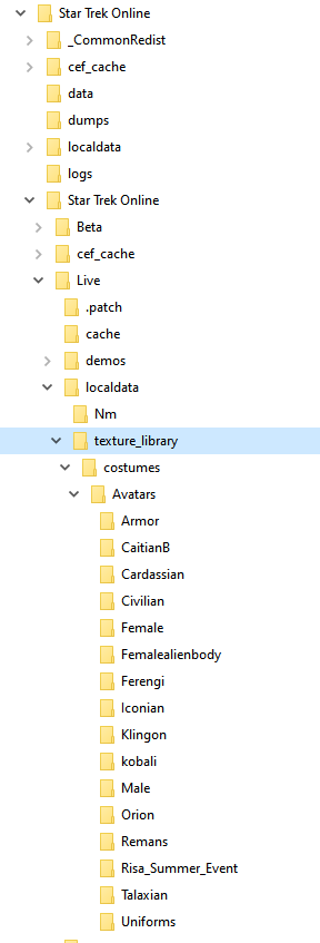 Copy the texture_library folder to here: Star Trek Online_en\Star Trek Online\Live\localdata