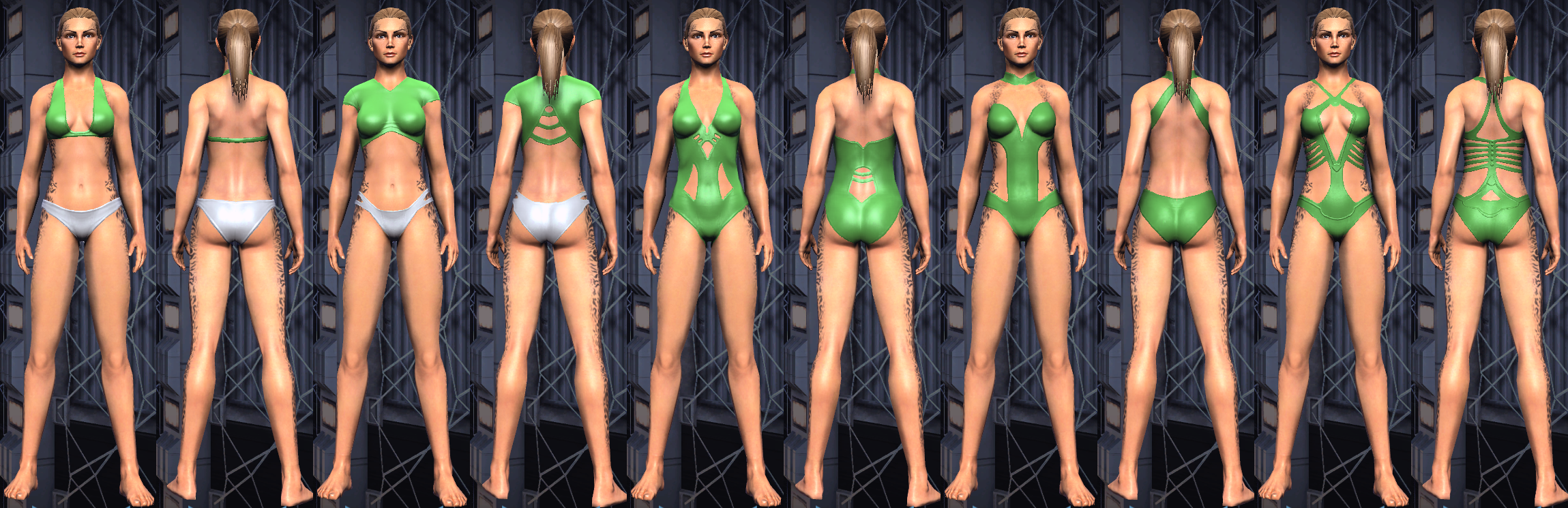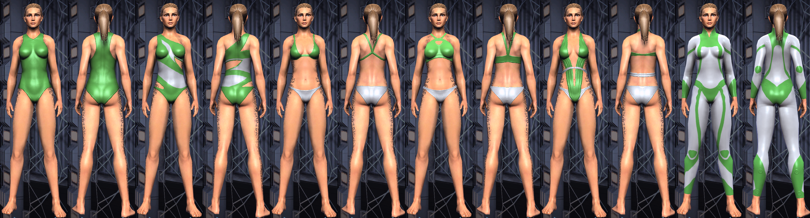 The female swimsuits are called, from left to right (note each has front & back views), "Swimsuit Bikini", "Swimsuit Cropped", "Swimsuit Cutout", "Swimsuit Halter", "Swimsuit Monokini", "Swimsuit One Piece", "Swimsuit One Shoulder", "Swimsuit String", "Swimsuit Tech", "Swimsuit Tie Waist", and "Swimsuit Wetsuit".