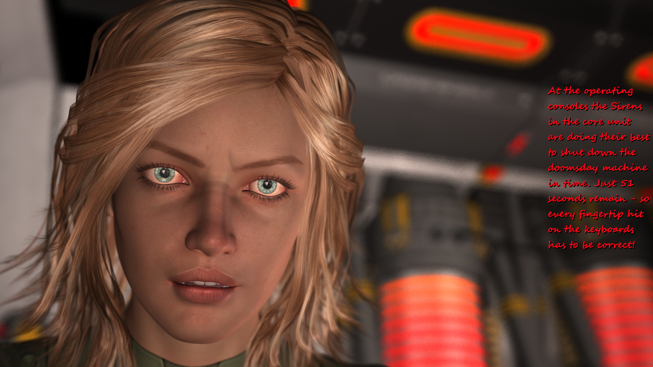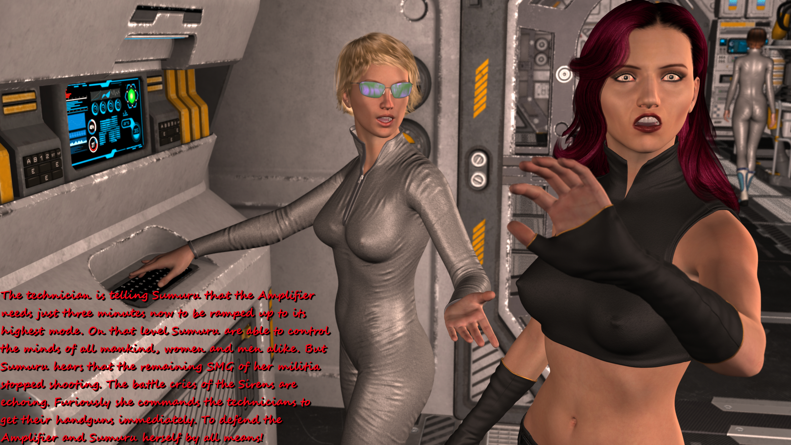 Interesting that Sirens' uniform is not hard enough to hide their nipples. I would expext they would be pressed hard enough to be not visible. But every Siren just showing them. It's not bad, of course, but somehow it's more exciting to see Sumurians' nipples, because they show them only few times. And mostly it's Sumuru or her technicians. It's also very well done in the second picture. I really like how the fabric of Sumuru's top looks stretched a bit. Sumuru is done with great attention to details. Shock expression, red corners of her eyes. her hand raised as if she tries to protect herself. This adds some atmosphere in the story.Yeah - here and there I like to depict those delicate details like butts or cameltoes or nipples. These skintight uniforms are perfectly made for this;-) I guess in the next batch you will like the close-up of your favourite Sumurian especially;-)...: