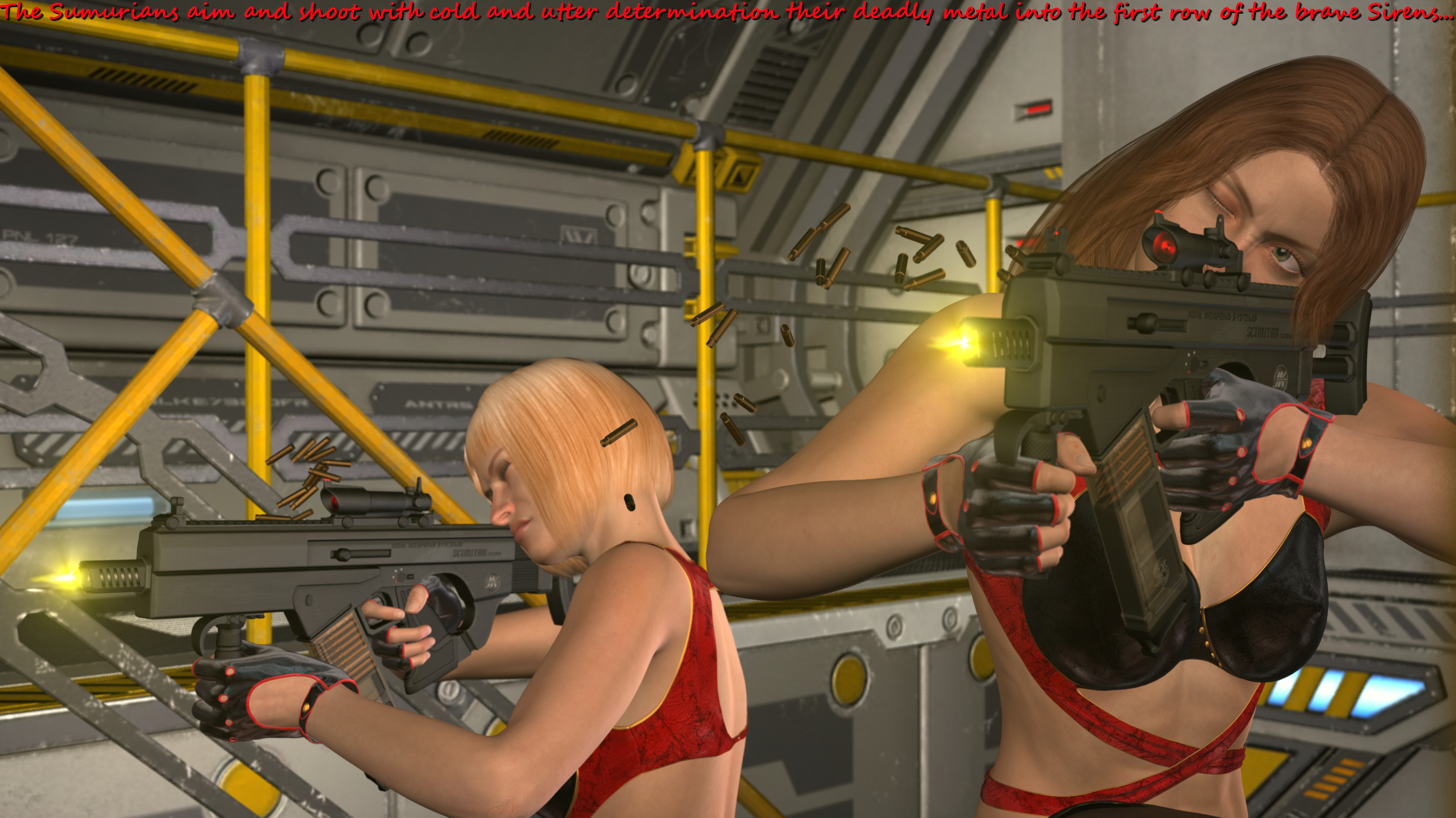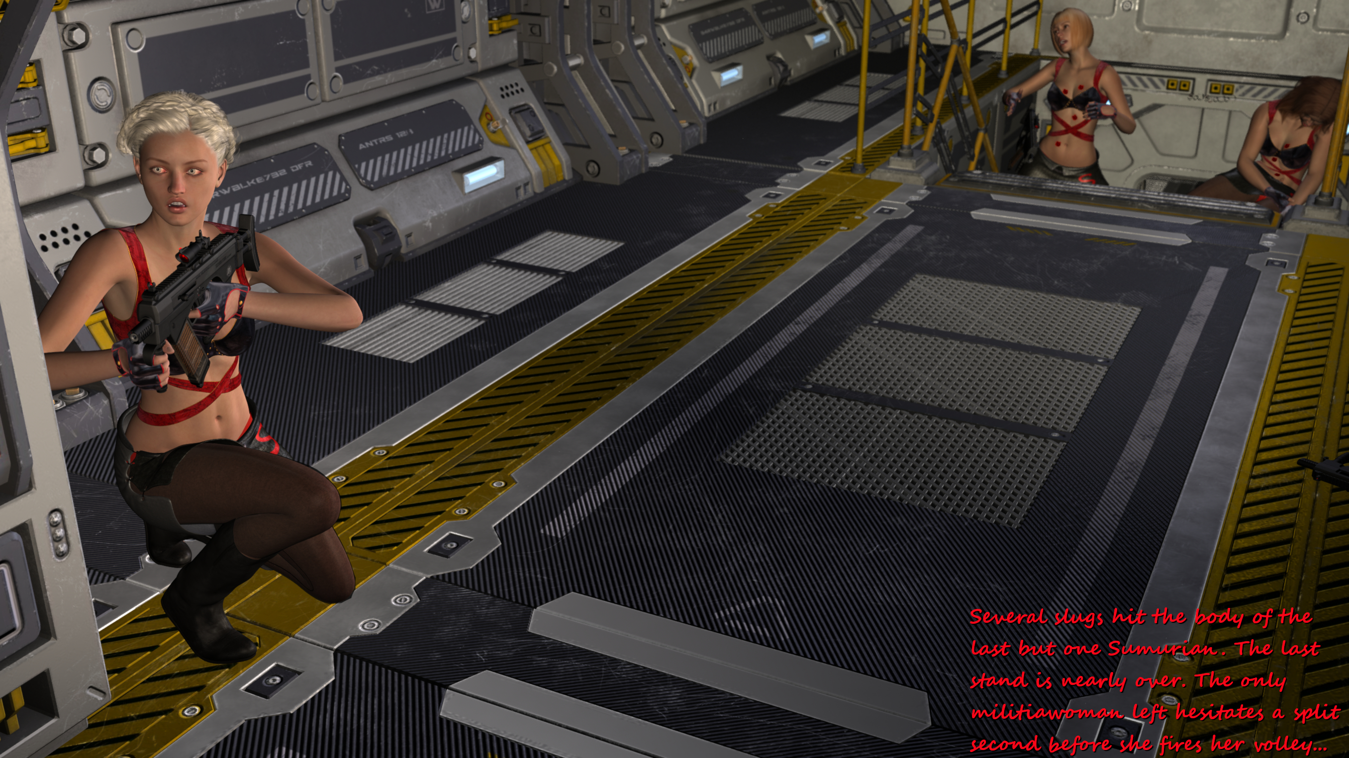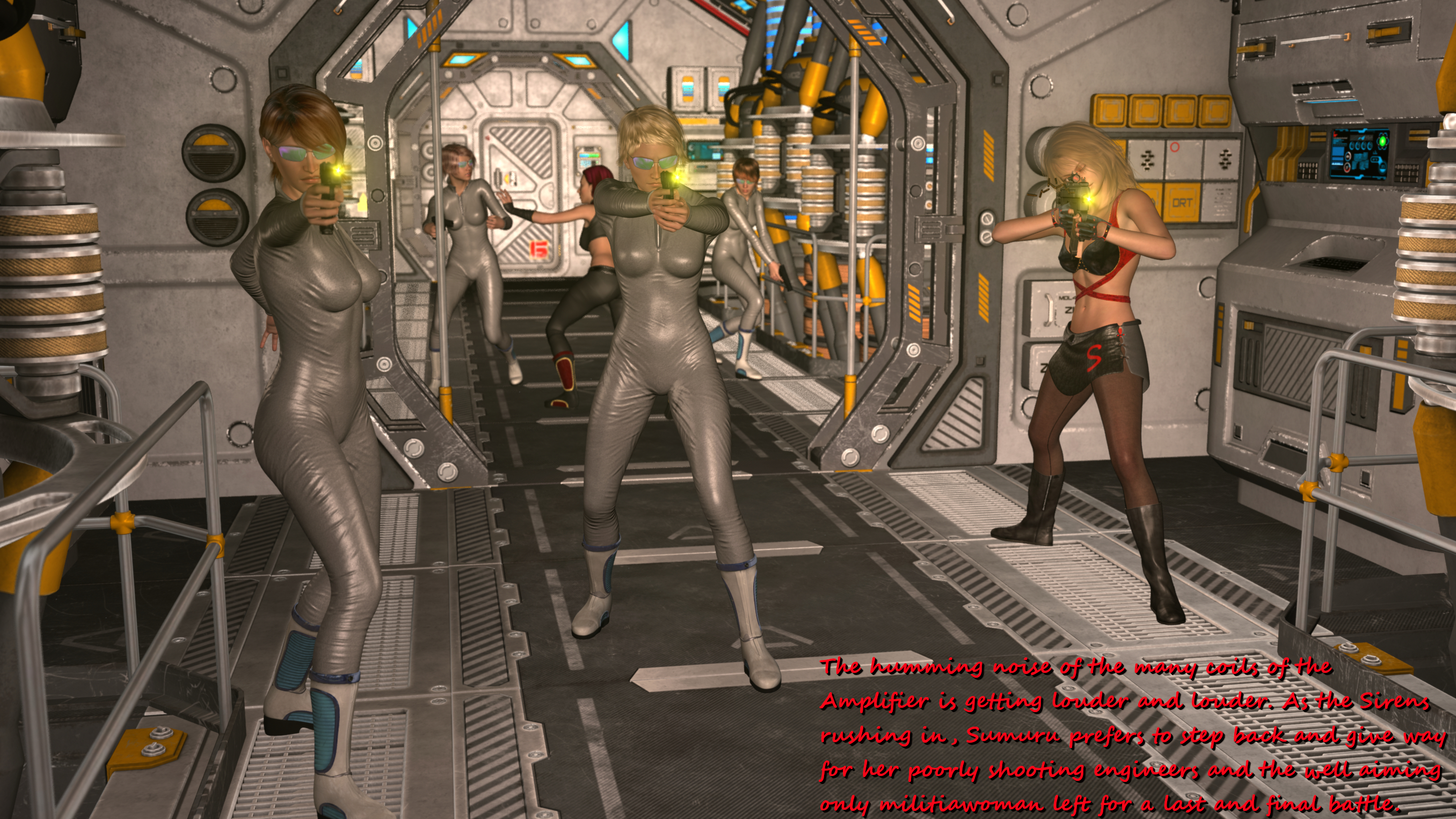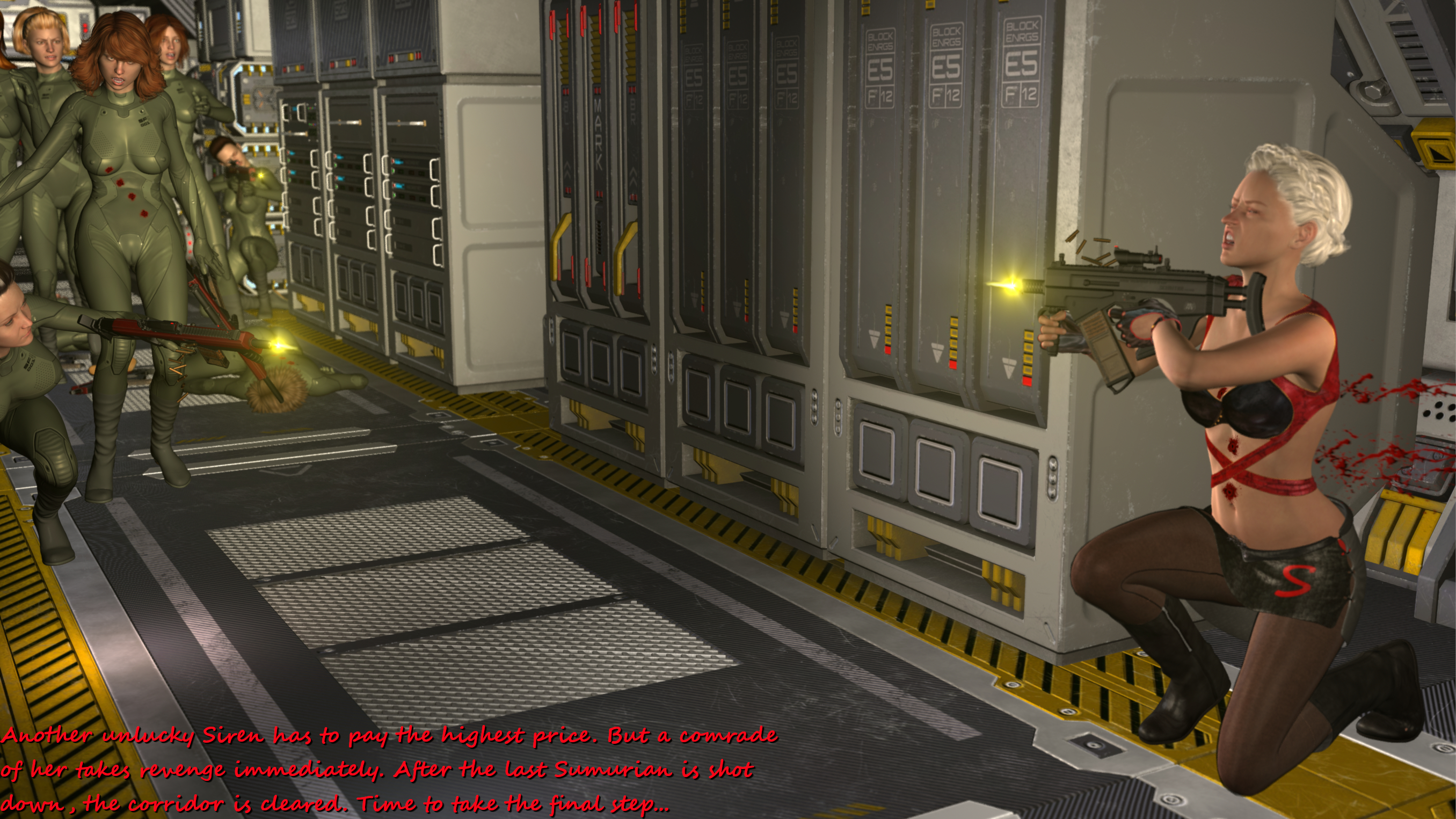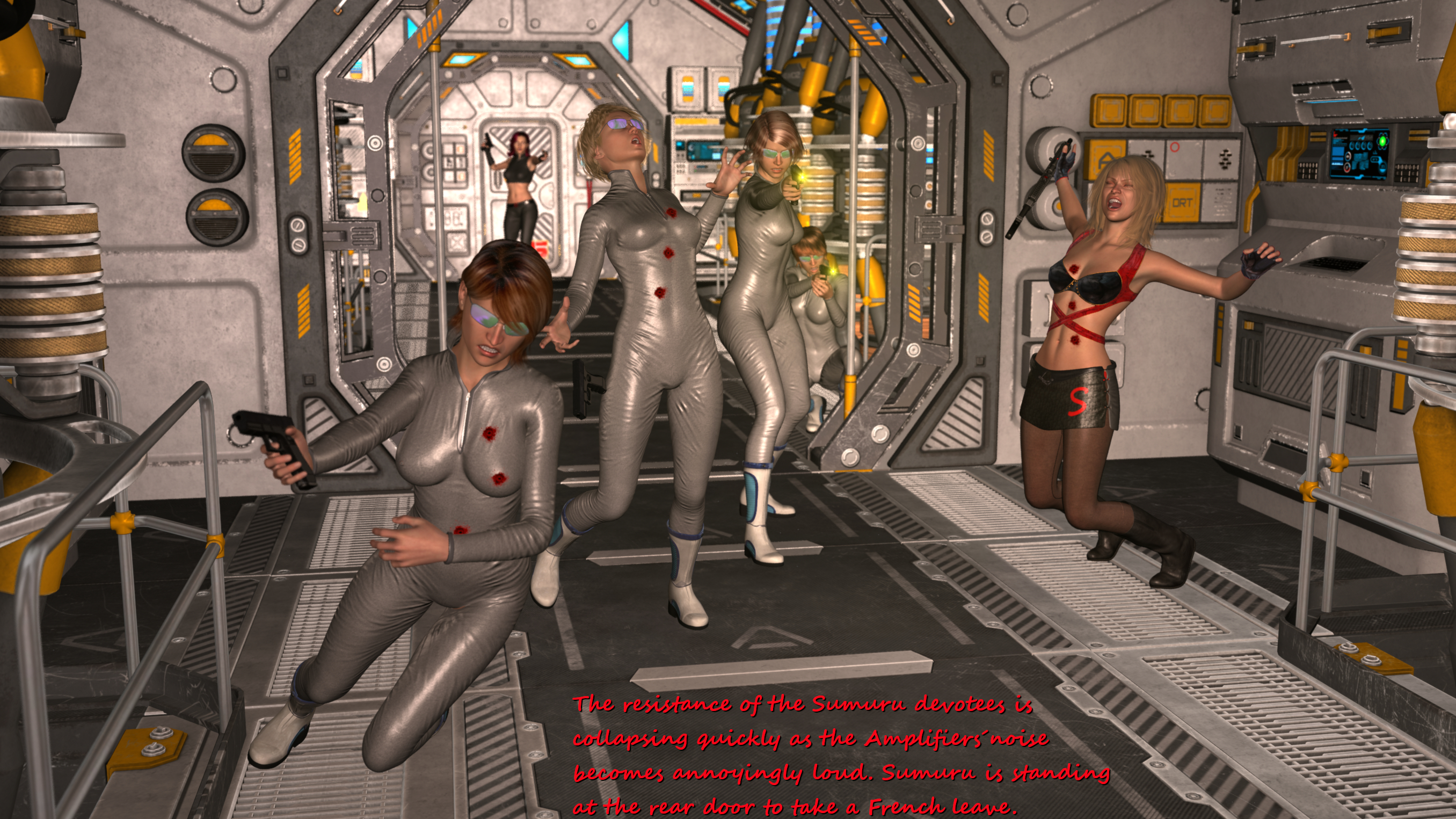 Great work! I'm weirdly hoping Sumuru has one last trick up her sleeve like another surprise machine gun massacre. Maybe a turret drops down from the roof. Almost want her to win.Yeah - here and there I like to depict those delicate details like butts or cameltoes or nipples. These skintight uniforms are perfectly made for this;-) I guess in the next batch you will like the close-up of your favourite Sumurian especially;-)...: