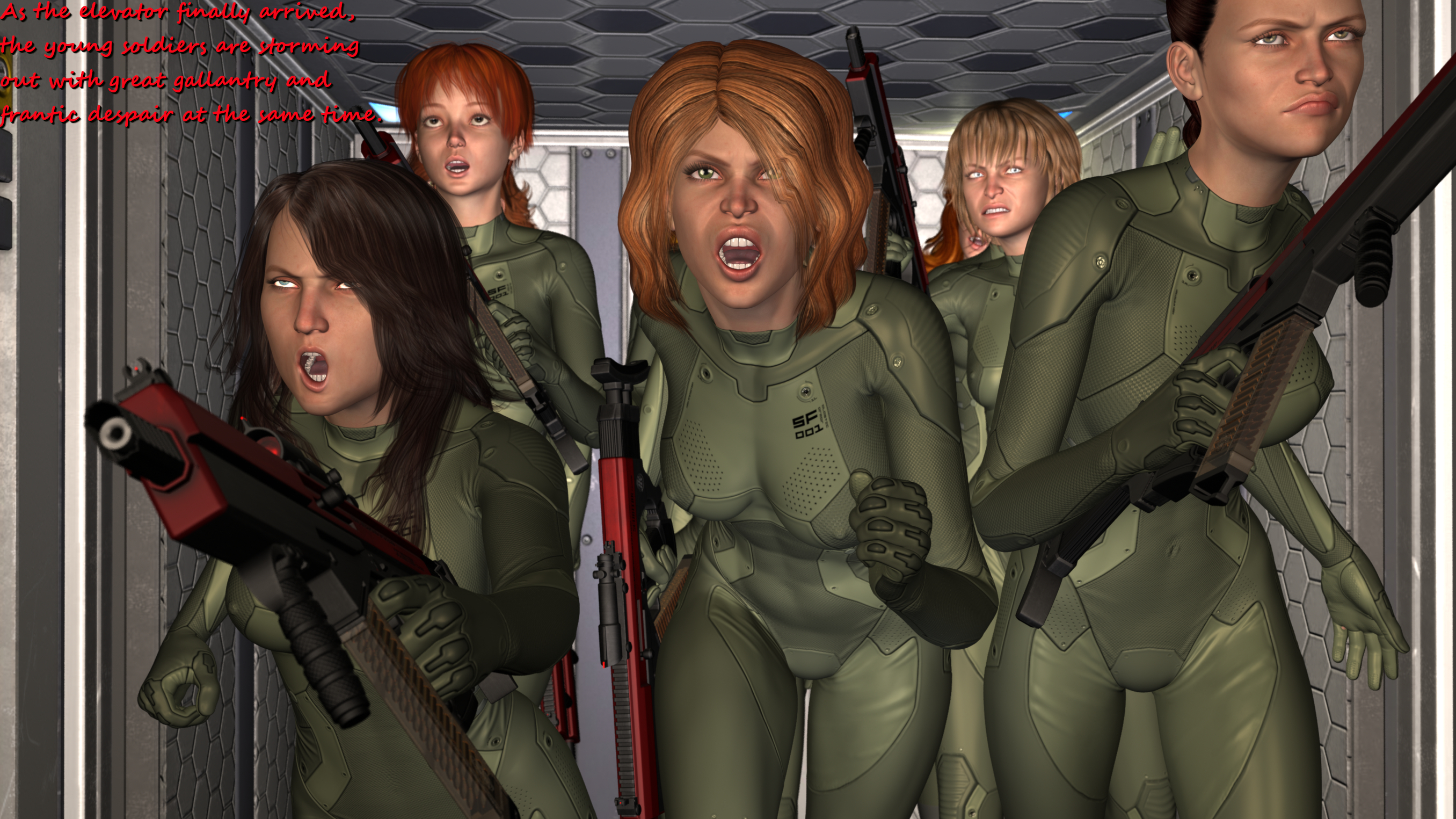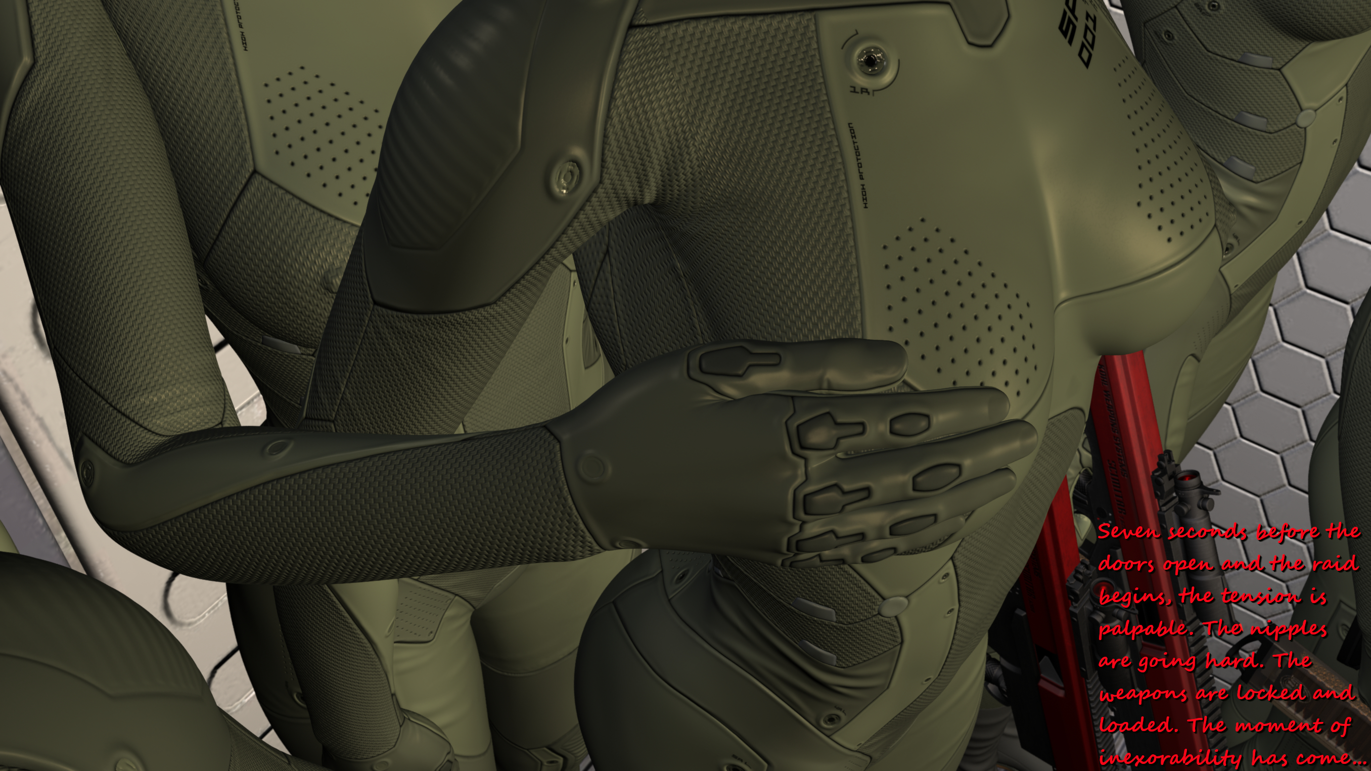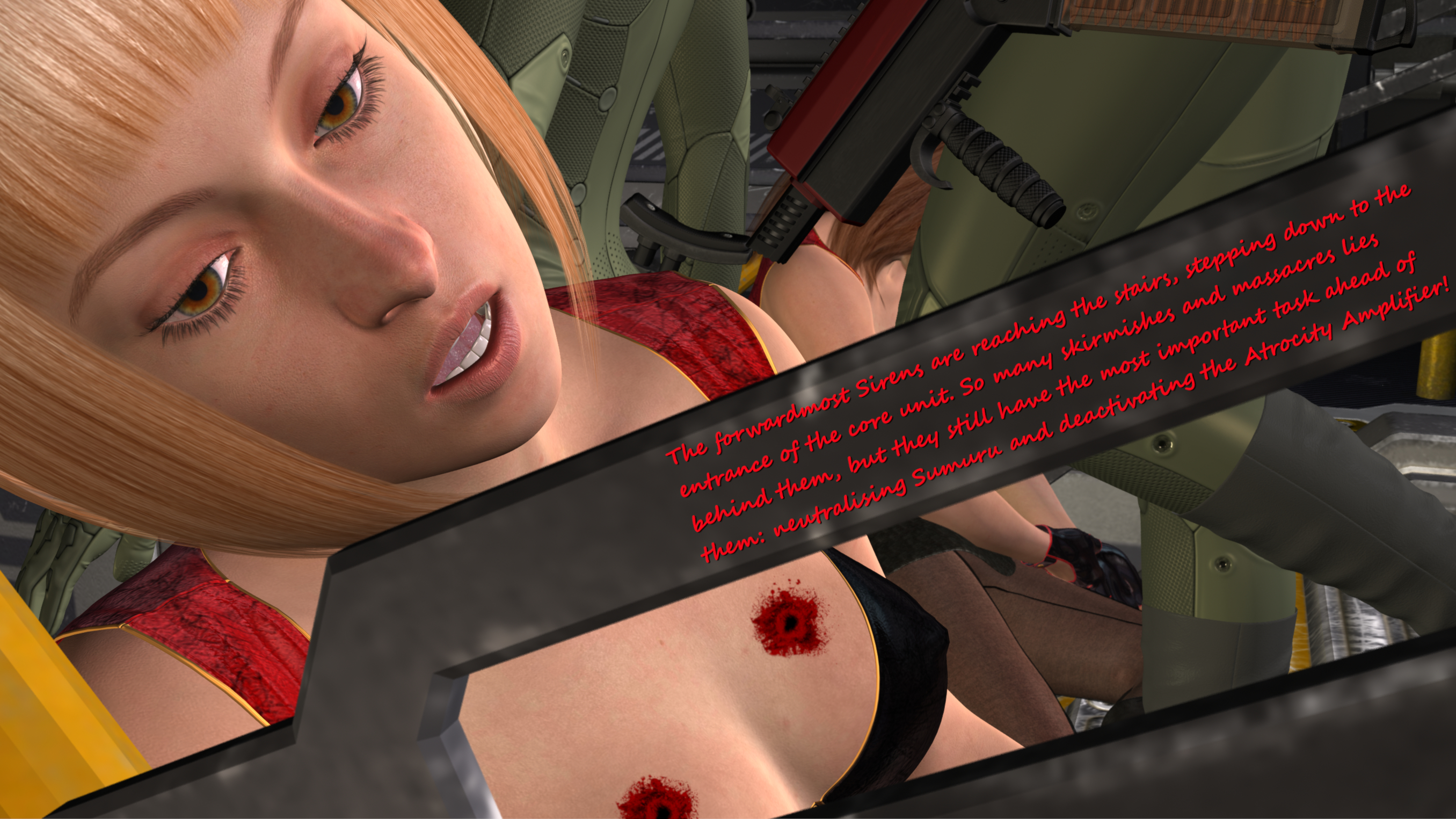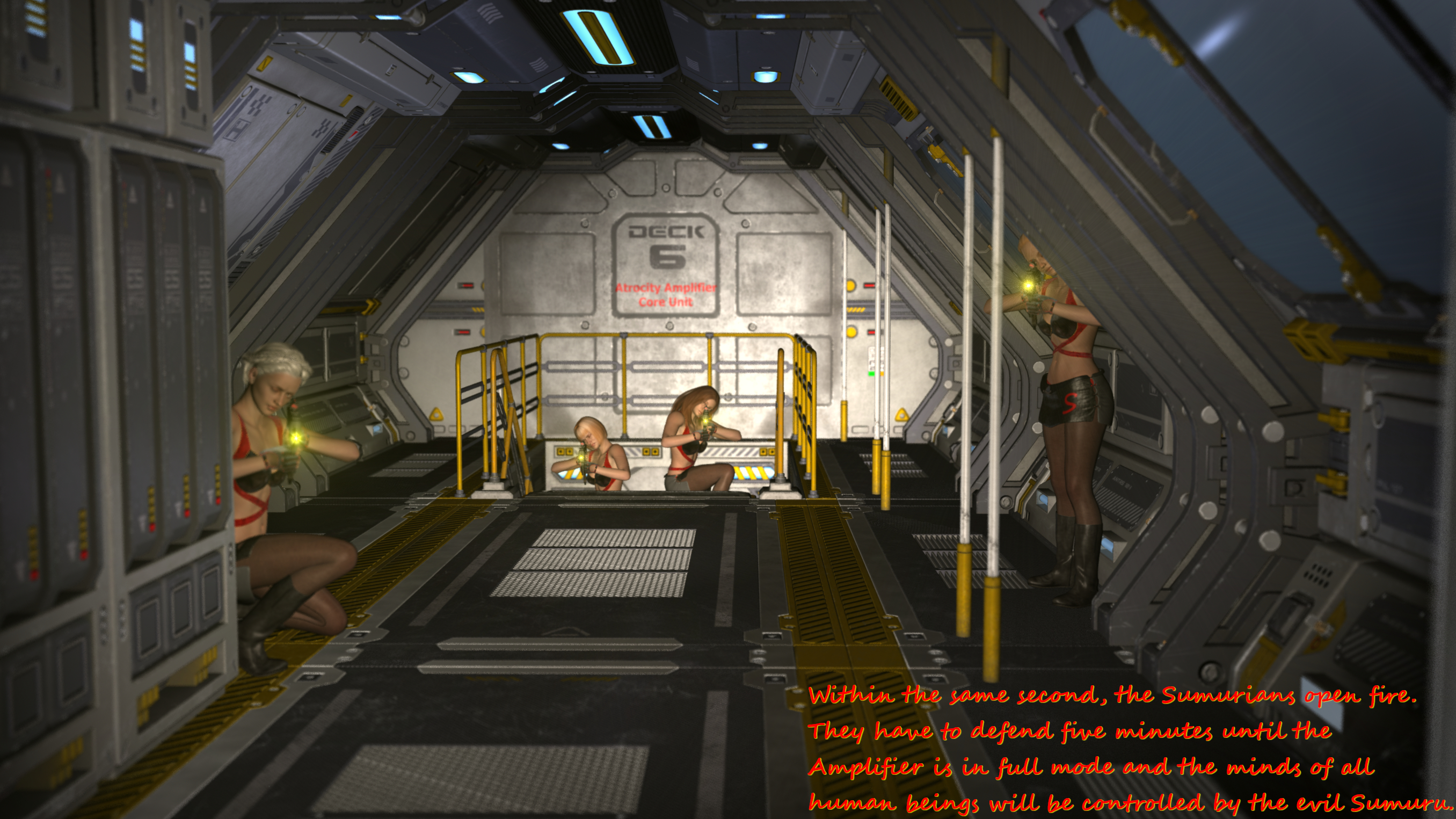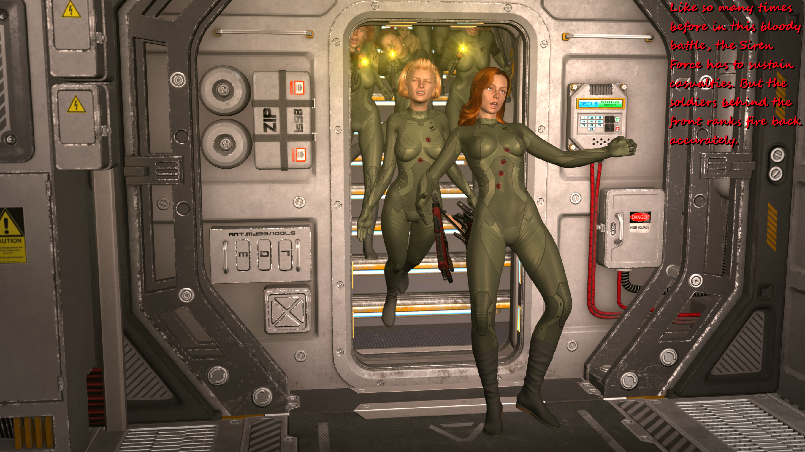 Great work! I'm weirdly hoping Sumuru has one last trick up her sleeve like another surprise machine gun massacre. Maybe a turret drops down from the roof. Almost want her to win.Yeah - here and there I like to depict those delicate details like butts or cameltoes or nipples. These skintight uniforms are perfectly made for this;-) I guess in the next batch you will like the close-up of your favourite Sumurian especially;-)...: