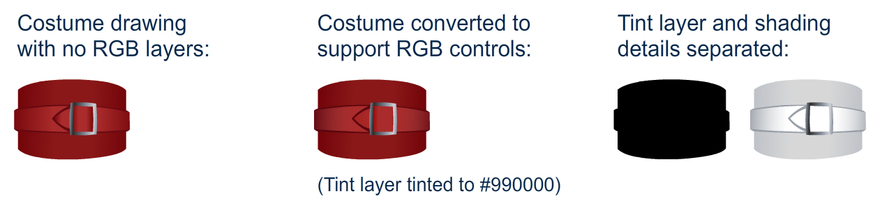To add support for RGB controls to your costume mods, each element of your costume needs to be split into a pure black base layer for the game to tint, and a layer for the actual shading, outlines and details which won't be tinted. The tint layer has to be converted into a movie clip and named "rgbFill" (Modify / Convert to symbol... then set the "Instance Name" on the properties panel.)