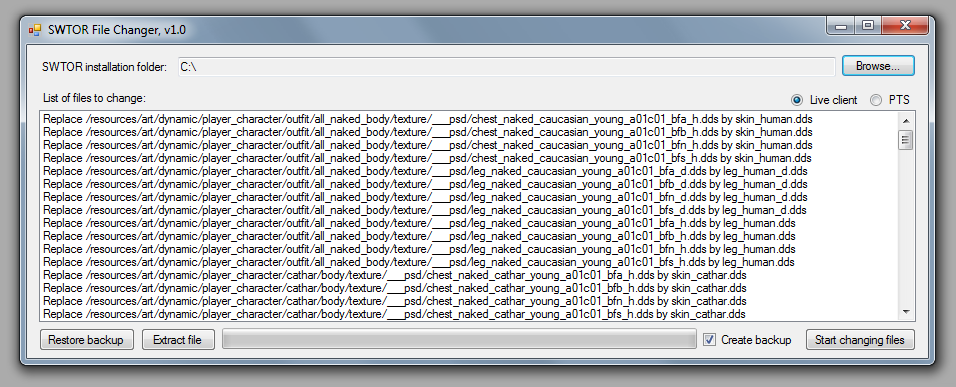 I understand that the main difficulty with modding SWTOR is the lack of any tools, so I decided to write one myself. With this tool, you can edit any file in the game, including textures. I included a readme, but it should be pretty self-explanatory. Note that you need to have .NET 4.5 installed to use this program.