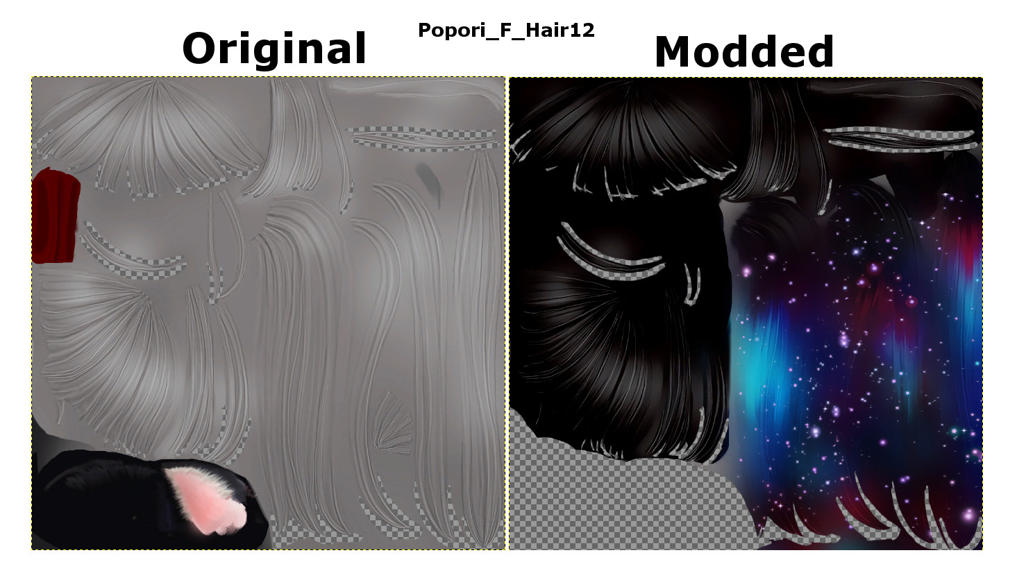 I've just been poking around in the hair.gpk so far trying to get a feel for things. Comparing the original to the modded has helped give some insight in what needs to be changed. I've discovered some of your unique edits mentioned above too, this one specifically blew me away!