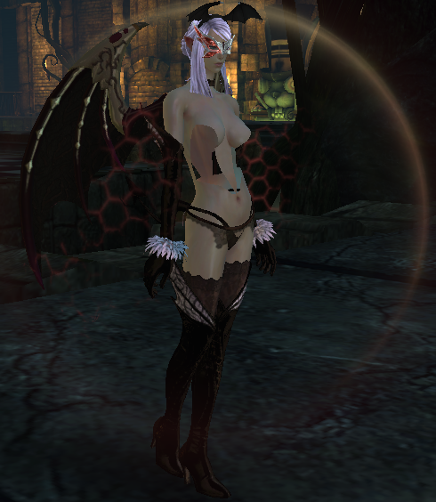 Discovered something interesting regarding the high elf succubus costume. After applying Event 16 - Succubus v1 and both of Naduron's human and castanic Event 16 mods I found that the high elf would appear whole when my character was a certain distance away. If I moved closer the holes appear. I play on a slow computer so it takes time for the change necessary to happen. I managed to take a couple screencaps. What is going on here?