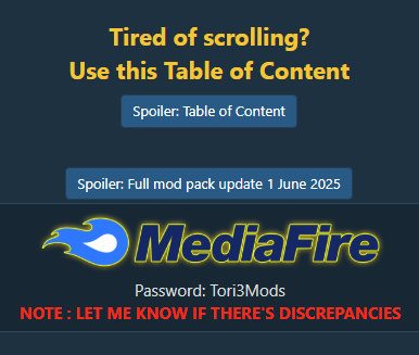 Added mod pack, will update after some mod release, let me know if there's mismatch or discrepancies
