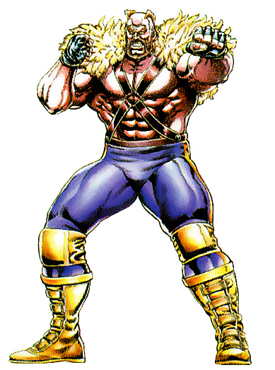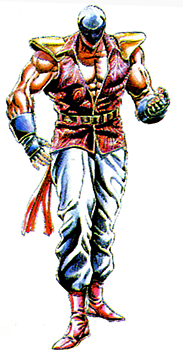 He's huge, wearing long black military pants and a black tank top. Tubes extend from a metal pack on his back to his gloved hands. His black mask has a white front with two large red ovals meant to look like eyes.
