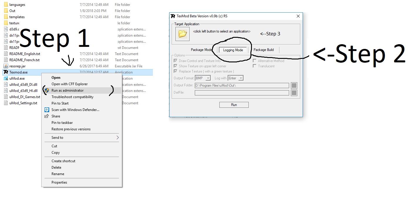 For example if a file called d3dx9_42.dll is by the game.exe. Move or copy the d3dx9_42.dll file to another location. Then copy the d3d9.dll included with texmod to the location where d3dx9_42.dll was located.