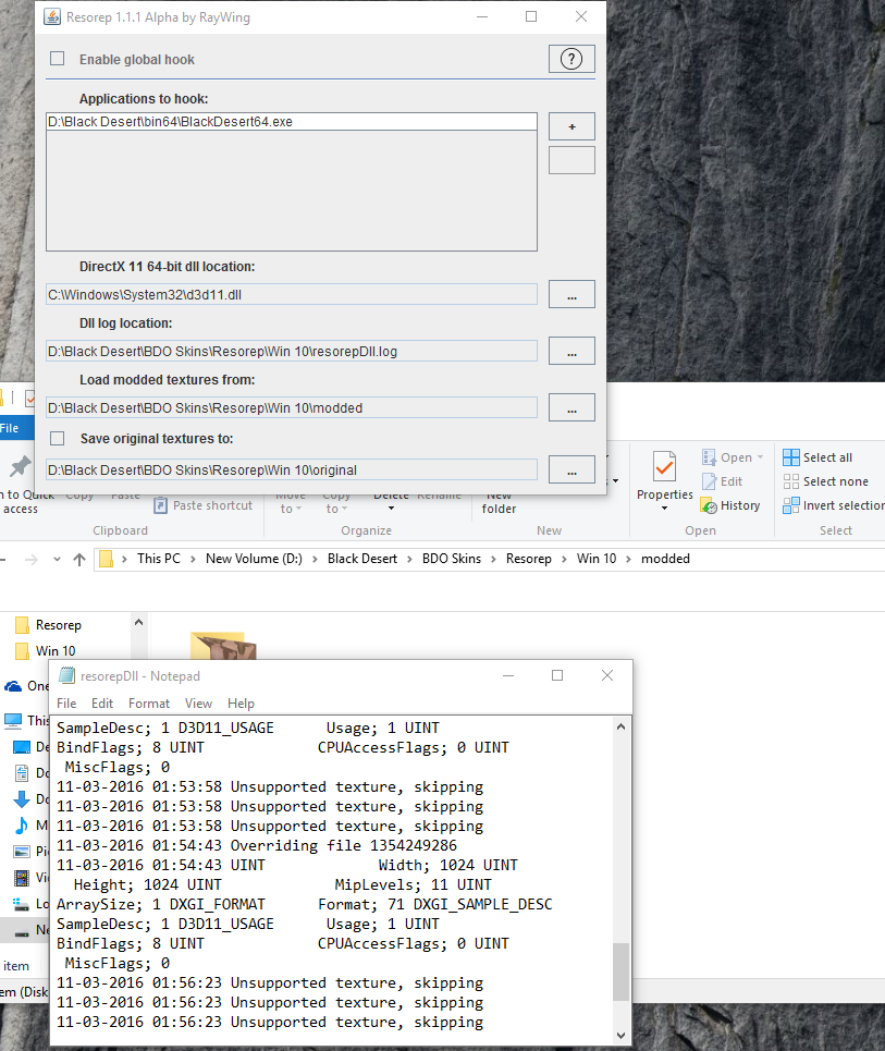 im using resorep also inside my black desert folder now, cuz im thinking that way the transfer of textures is faster (even maybe it doesnt) but aslong i believe it its fine lol Xd