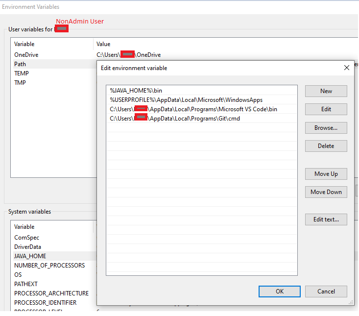 And I also had to make sure that the right environment variables were set in Windows. Here is where my other big issue came for me. I recently reinstalled windows in my PC and realized that you could have two types of Windows accounts in your PC, one is the Admin account and one is the regular user account. You can look more into this but basically is a way to minimize the risk of some apps running on their own when you don't want them to, by having to ask yourself for the admin account password. However if you are or decide to go in that route by having 2 accounts or more in your pc. Then you need to keep in mind the environment variables section as some variables are set at the "System level" meaning with your admin account. and other "User Variables" are set by the user which do not ask you for a password to set them. For me for some reason I had to set the path variable to include %JAVA_HOME%\bin in the "Environment Variables for your account" pop up for windows.