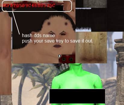 With ESO, its best in my experience to use the character selection screen to begin hunting for images. This reduces the image count and prevents other people's models from being loaded. So select the character you want to export textures from, use your hotkeys, find the images you want, and hold down your save key for a second. An image will appear in the folder you mapped during the previous stage. The name of that image will correspond with the red name in the upper left hand overlay on your screen.