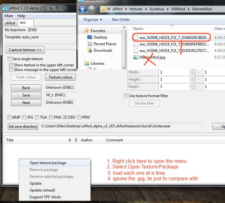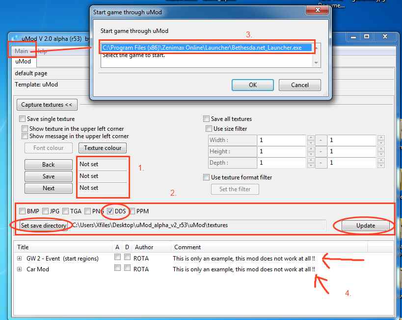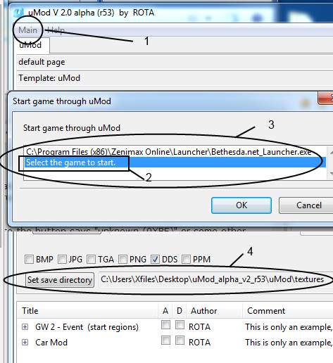 First, set up a directory to hold your exported images. This is where umod puts the images you export when you push the save hotkey you mapped. Then. Go to the main tab and select "Start Game through umod". and highlight select game. Browse to the ESO launcher and select it. The image below should help: