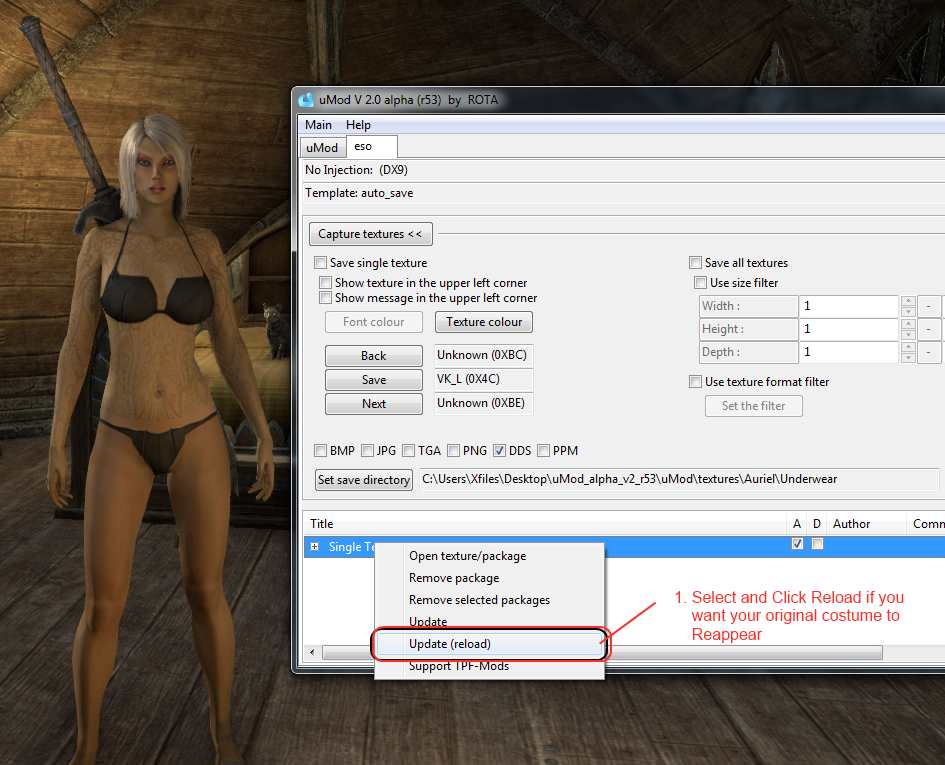 Launch your game. If you modified your character's texture, it will stay modified until you switch any clothing/armor item (mostly). To keep from loosing your changes, stay within your motif set for its level range defined. The level range armors of a motif all have the same texture. So if you switch to a differently enchanted set of Bossemer leather of the same leather range, you can alt+tab, right click in the bottom window, and select "Reload". Your modified texture for bossamer leather jack lv 5-9 will happily accept your modified texture.