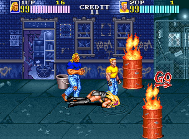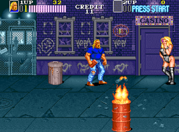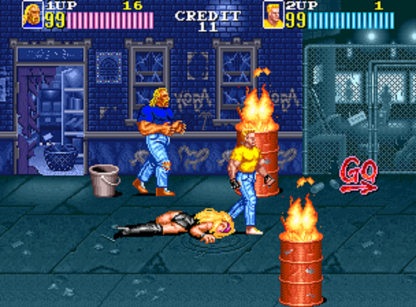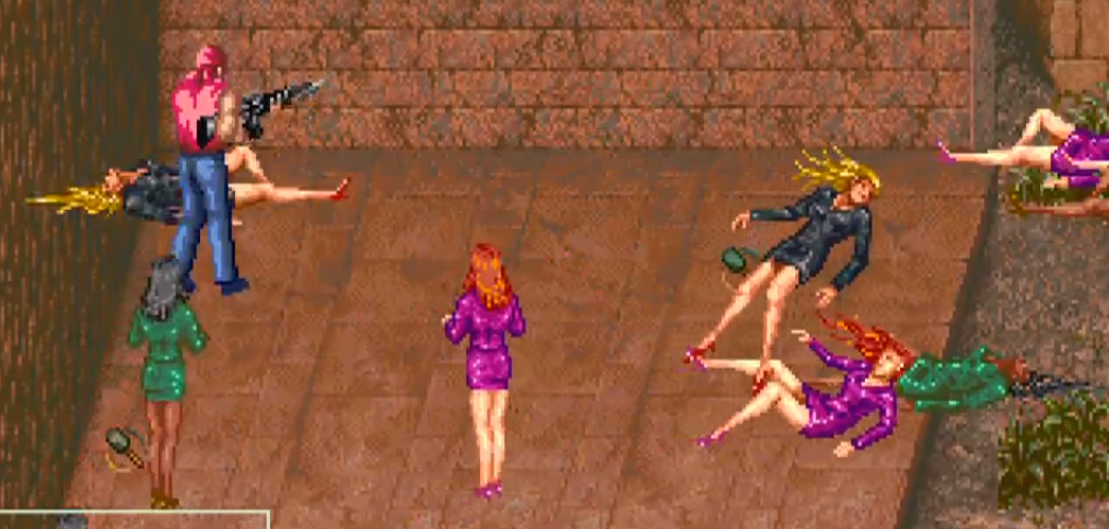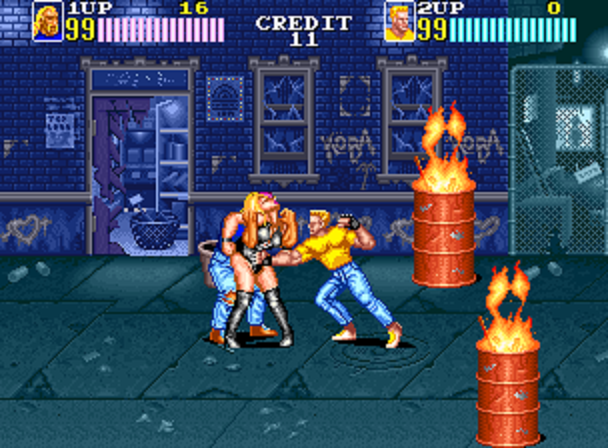 Or Crime Fighters 2, where the female dominatrix enemies can be slammed into a wall, then kicked or elbow dropped while they're on the ground:
