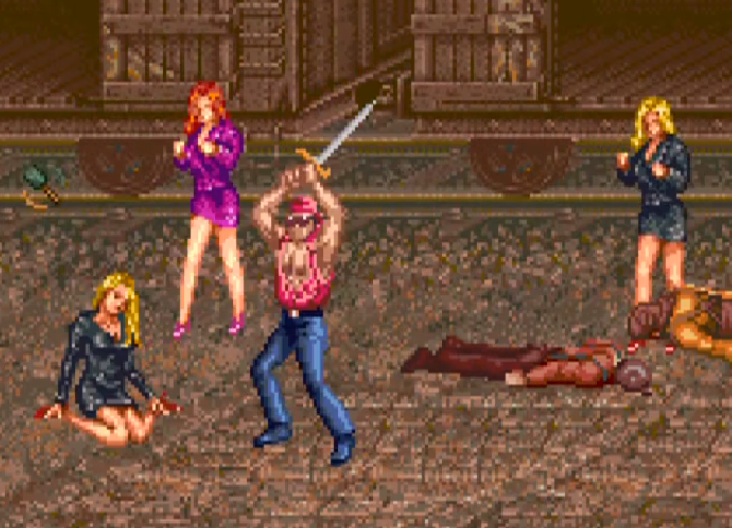 However, consider some other heroes under other circumstances. For example, in every game of the Streets of Rage series, the heroes beat the stuffing out of numerous female thugs / henchwomen / zako without hesitation, and in some cases they go even further, throwing them off of high buildings or (in the Streets of Rage Remake) defeating them in a gory and gruesome fashion using swords or high explosive weaponry: