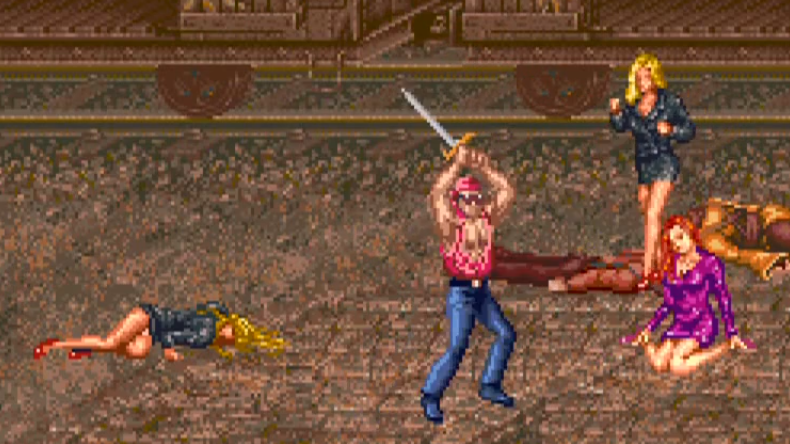 Think of the evil henchwoman Poison from Final Fight going up against the huge and brutal hero Mike Haggar. Or consider Golden Axe where the common female "Zuburoka" enemies are slaughtered just like any other enemy:,