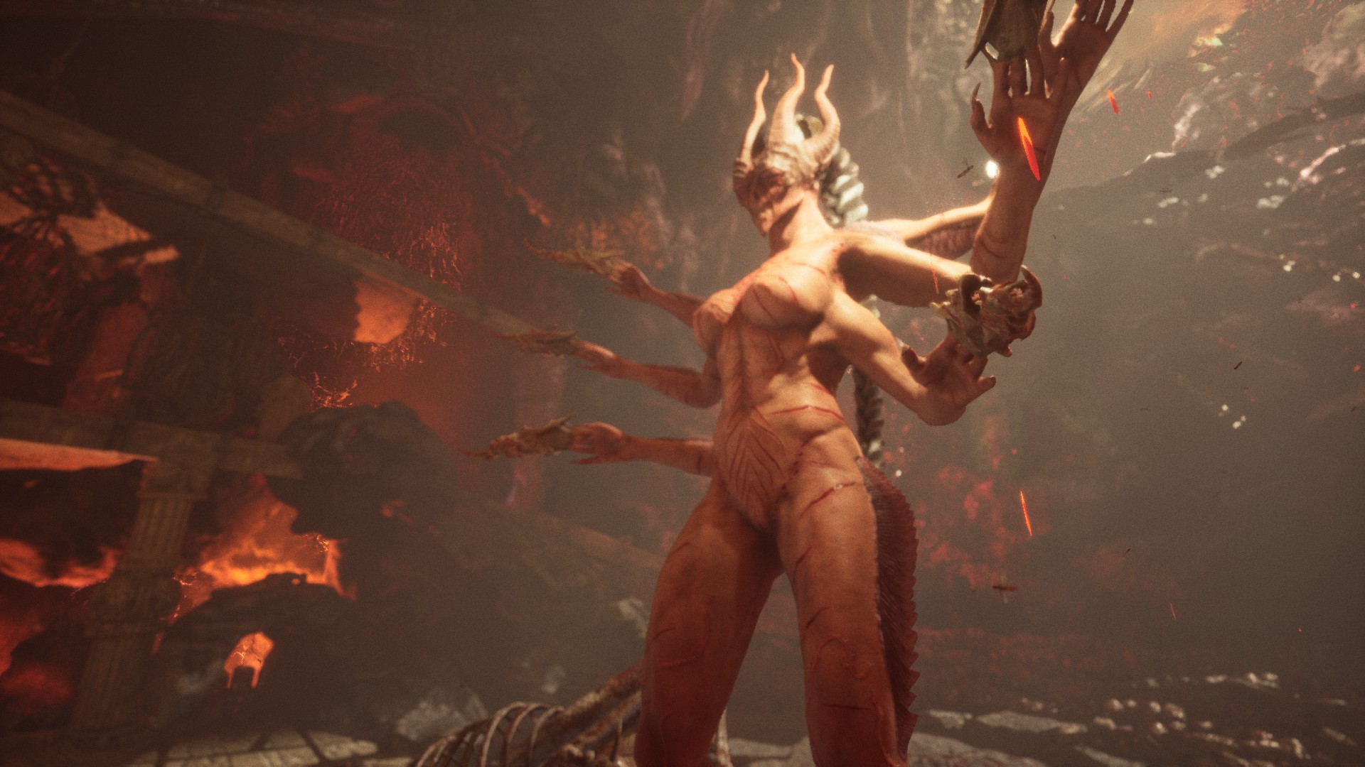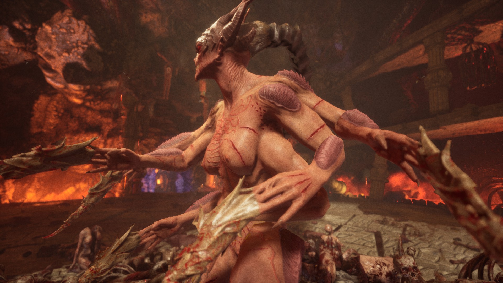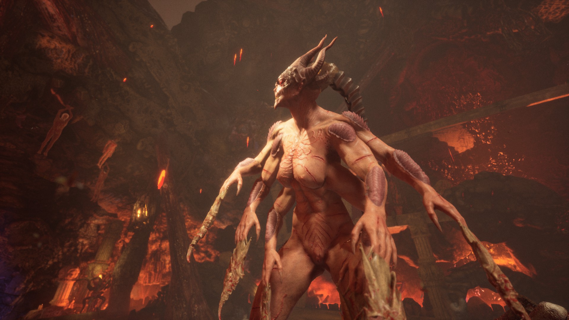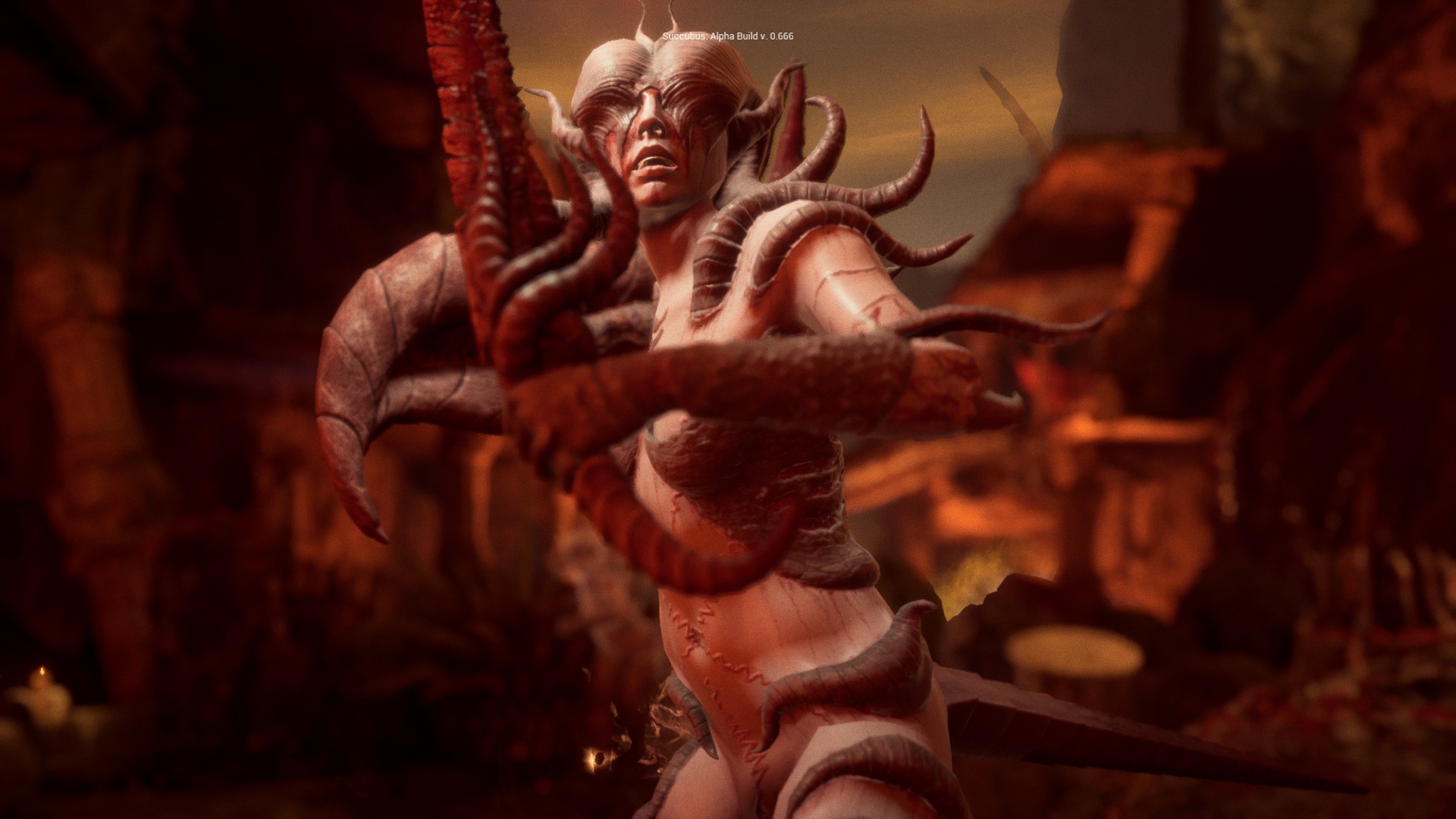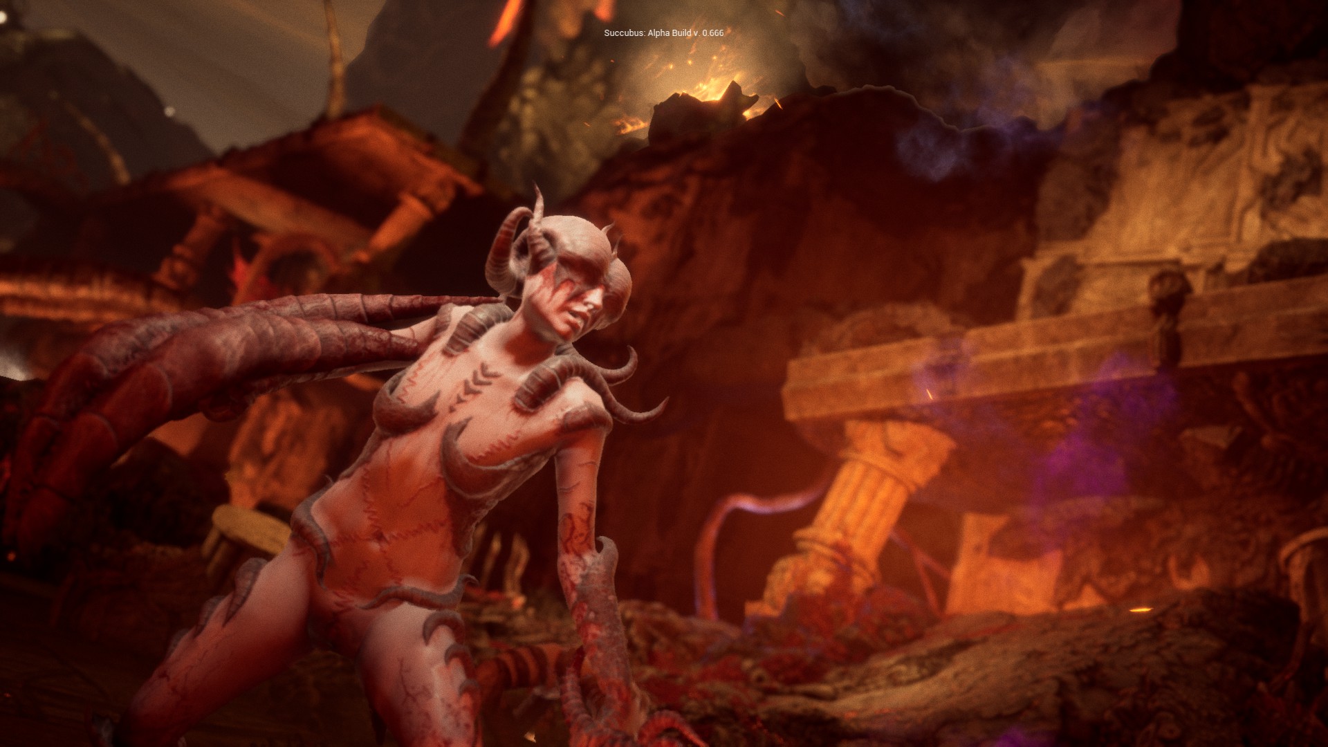 So Agony's creators, Madminds, are doing a new game called Succubus that has more melee combat than the original game, and where you play as a sexy succubus in first person view. The usual damned humans and the Onoskelis demonesses aside, there is a new type of female demon enemy, as well as a hot muscled 6-armed demoness end boss in the trailer.