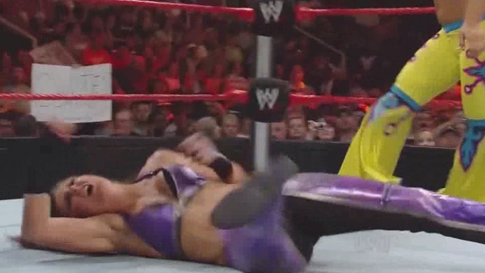 Classic WWE ryona moment - My all-time favorite diva, the massive Amy Christine Dumas ("Lita"), getting her shit utterly wrecked by some nameless/faceless 'roid junkie who leaves her splayed and shirtless in front of the crowd as she cowers in fear.