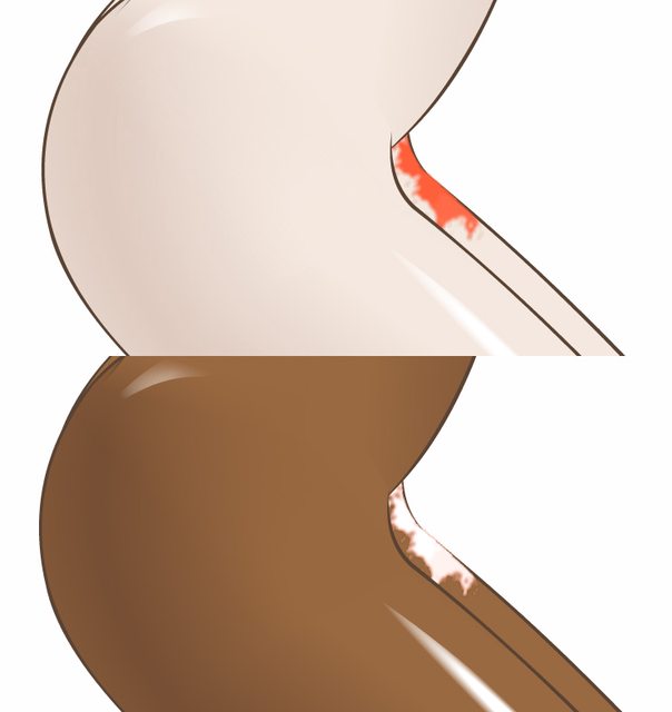 The PSD and PNG files included a dark outline on the ventral edge. I remove it because it stuck out very noticeably, and because it was superfluous (that edge is shared with the outline of the thigh, so there's already a dark grey outline in place). There remains a lighter gray outline around the entire creampie mark.