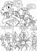 P5: The SMs charge the raiders. What a mess! Front and center: nice display of martial arts, heh? You will notice a slight beaver display by the SM that does the flip out of the pool. Lower left: in a display of shooting virtuosity, a SM manages to struck down two raiders with harpoons in her navels. Next right: a SM fires on the raider at the foremost right, who grabs the shaft that has just impaled her with a surprise look on her face.
