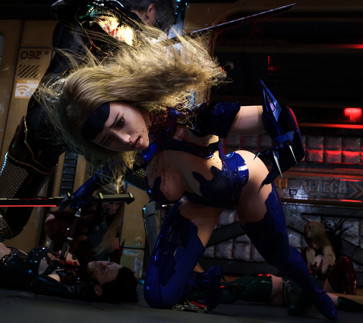 The three chicks at the lower right corner: the one in the back dies the way I keep preaching about: her bellybutton aflame by a direct navel hit, she screams her death at the top of her lungs. The second one is hit on her crotch and yes, she enjoys it a bit too much for someone who is going to die in a few moments. Third girl I am particularly proud of. Hit by a laser bolt in her navel, she looks at it in both pain and shock while a bold (and horny!) Sigma raider takes the chance to literally go at it. Nice, huh?