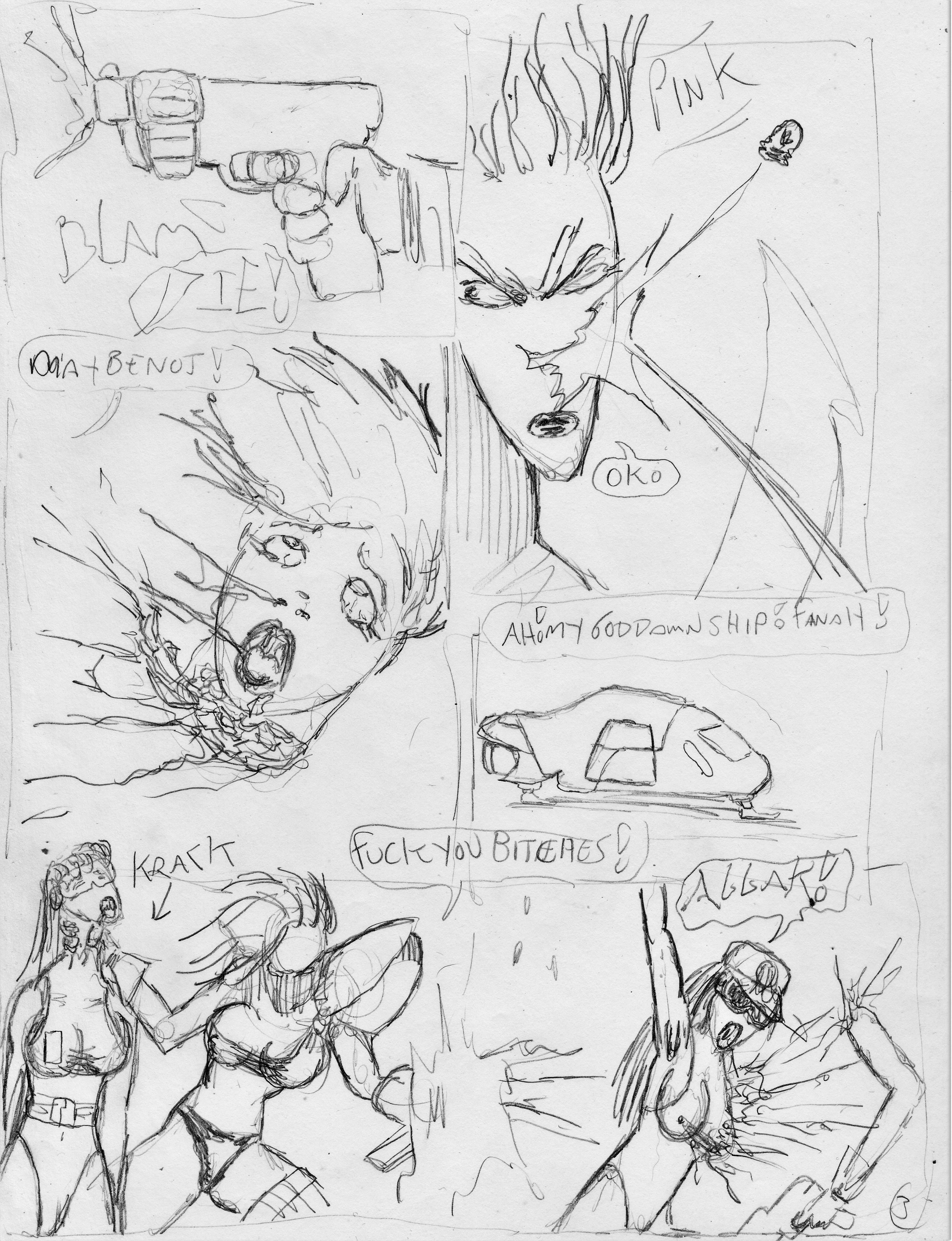 P3:I particularly enjoyed drawing the first space marine that dies. Hit by a laser bolt in her navel, she looks both horrified and agonizing at it, while her body reacts differently (notice erect nipples and the explosive orgasm). She then falls to the floor while covering her fatally wounded navel, trying to keep both blood and guts IN, to no avail.