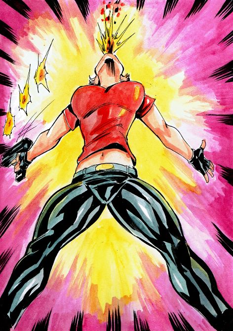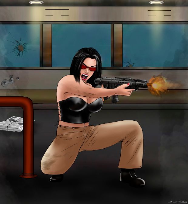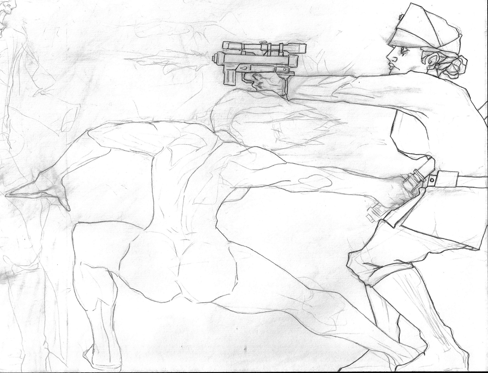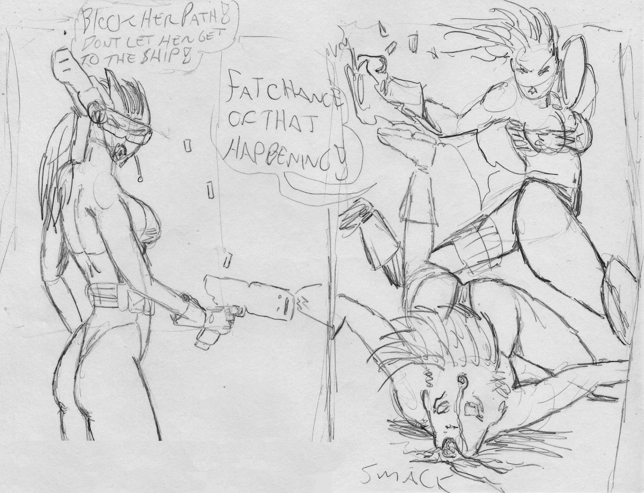 And gone: hit twice on her chest and once in her navel. Bye bye. Multiple shots can be a bit messy to draw, but I always strive to provide ample coverage of the scene.