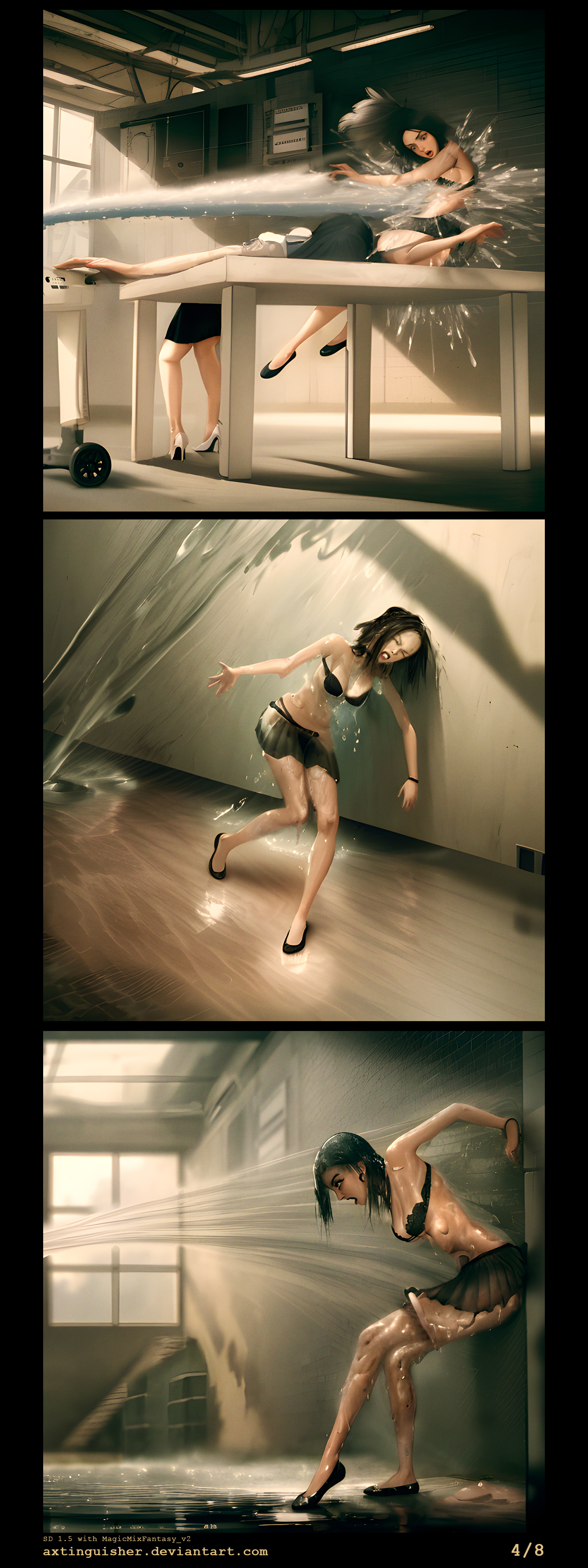 A recent ai-assisted strip I did recently, so after some chase and fight, a weakened heroine gets in trouble, but finds a way to fight back at the last moment.